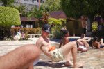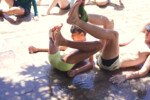 Brincadeira com água é sempre maravilha num calorzão desses, né? Hoje foi dia de brincar com calça quadrada, por assim dizer. O jogo arraialesco de Bob Esponja consiste em pegar uma esponja encharcada prezando ao máximo por não espremê-la antes da hora. Tem que passar por toda uma fileira de pés e mãos para tentar encher uma garrafinha primeiro que o adversário.