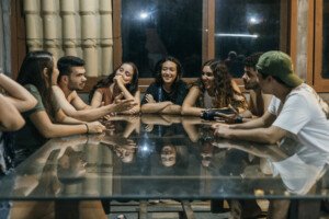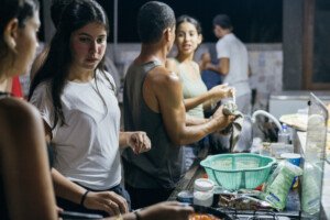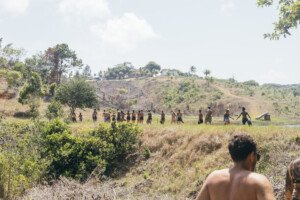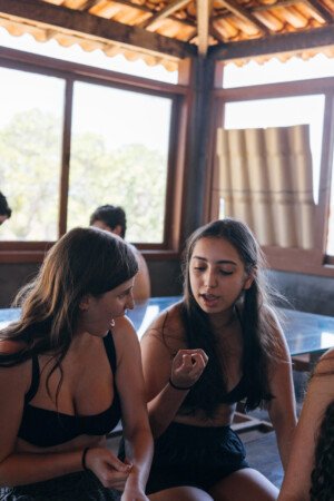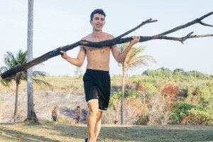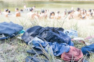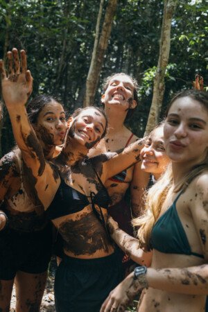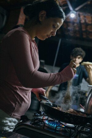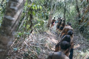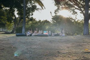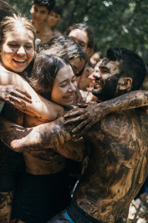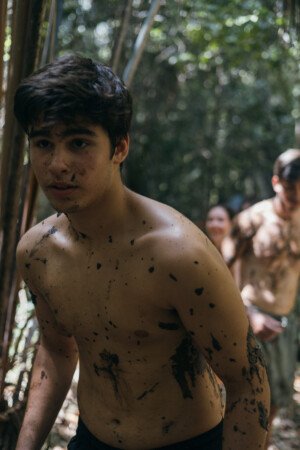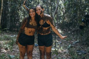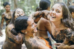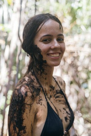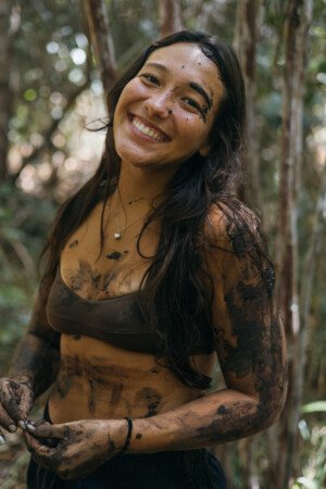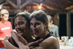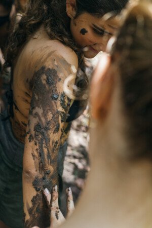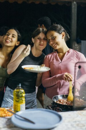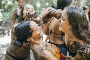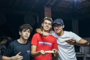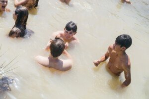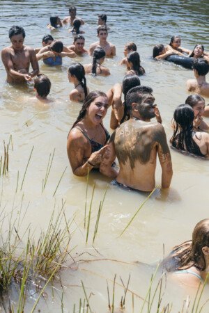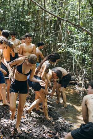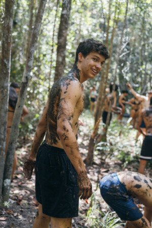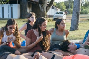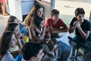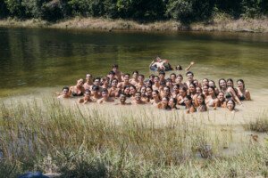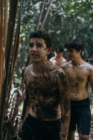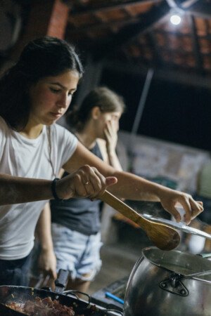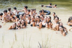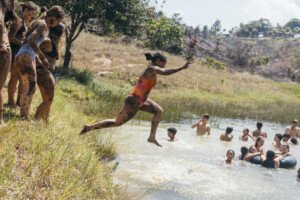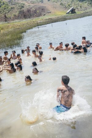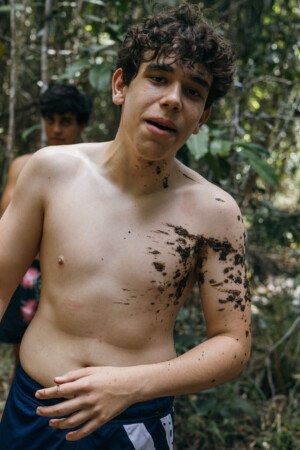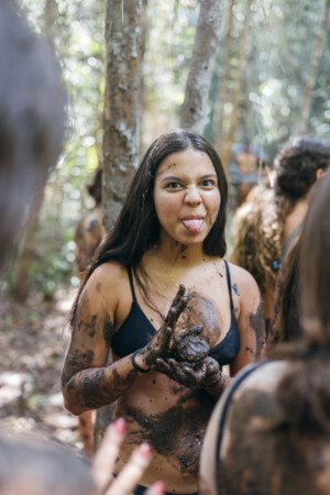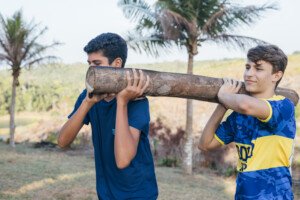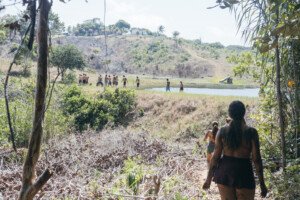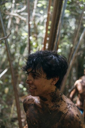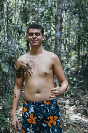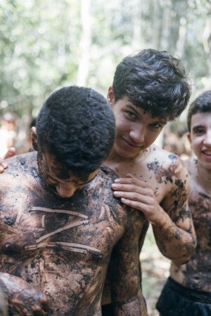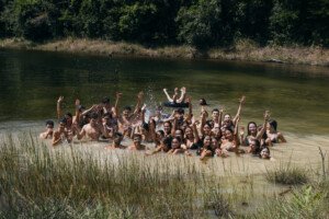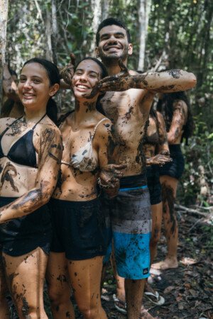 Chegamos em terra firme nas mágicas horas da manhã em Imbassaí. Momento de sentar e apreciar a natureza, de criar laços com o grupo. No campismo é quando os Zambiapunga puderam relaxar das árduas horas de brincadeiras no Arraial e se sujar de lama e infância. Deitados e espraiados, uns cantavam enquanto outros dormiam, outros ainda jogavam cartas ou conversa fora, mas certo mesmo é que se organizar direitinho, todo mundo se diverte.