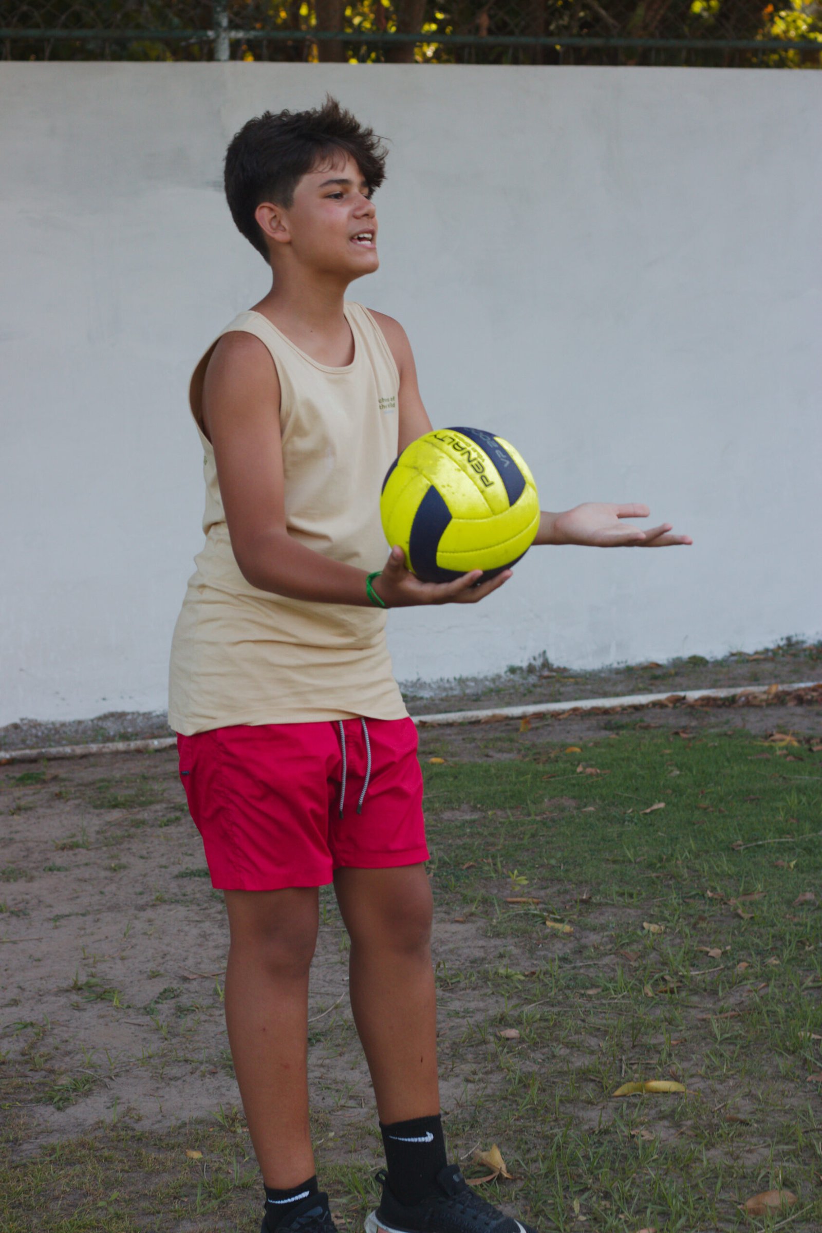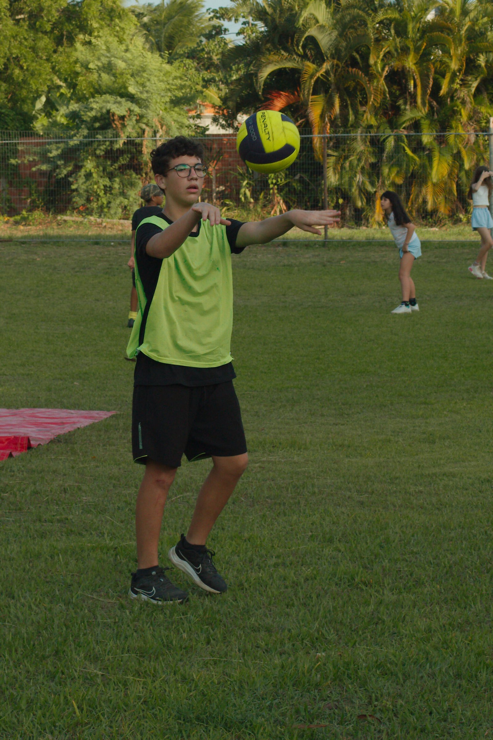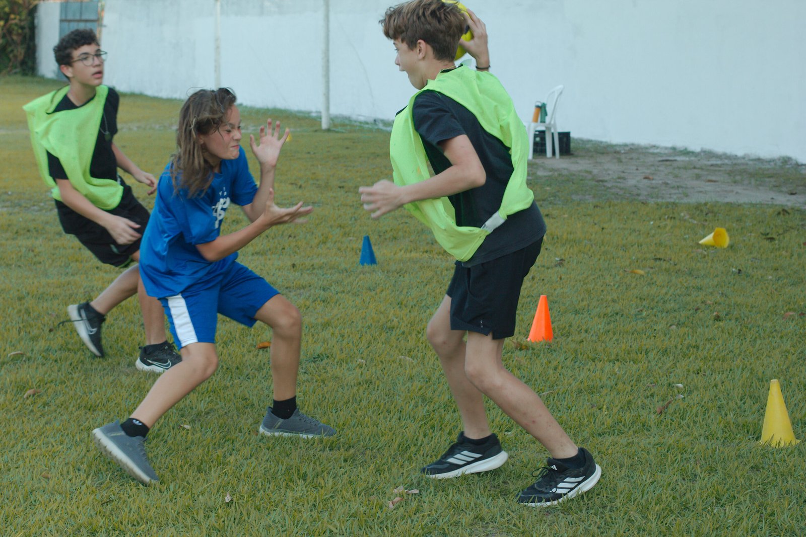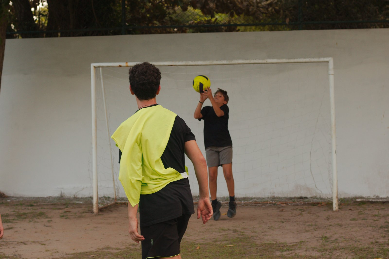 O jogo é um mistura de baleou, handebol e futebol. Pois as equipes ao passar a bola para o colega é preciso jogar com a mão. A movimentação acontece livre, de um jogador para outro até chegar próximo ao gol. Porém na passagem da bola os jogadores podem balear o adversário e o mesmo fica sentado baleado até alguém do seu time agarrar a bola para que ele siga no jogo. Seguindo a ordem da gincana, o grupo foi divivido nos times Jereré e Jamales. E a galera não decepcionou, seguiram as erras de forma leve e divertita mas com muita disputa para alcançar os pontos para sua equipe.