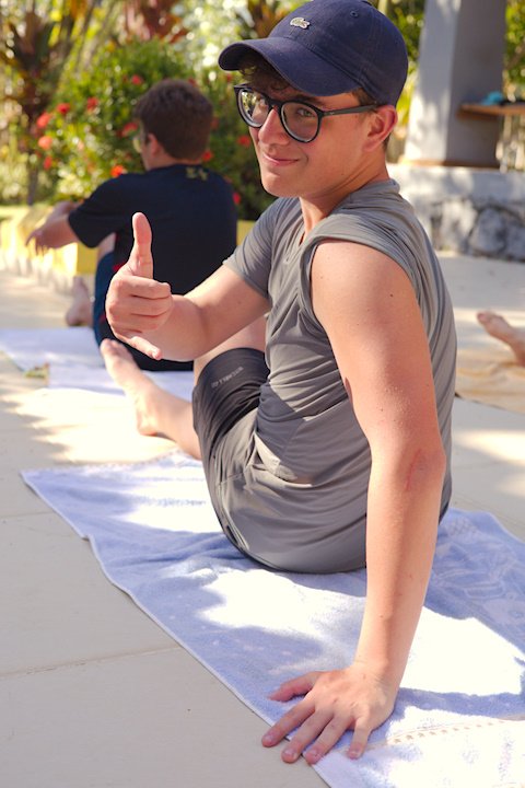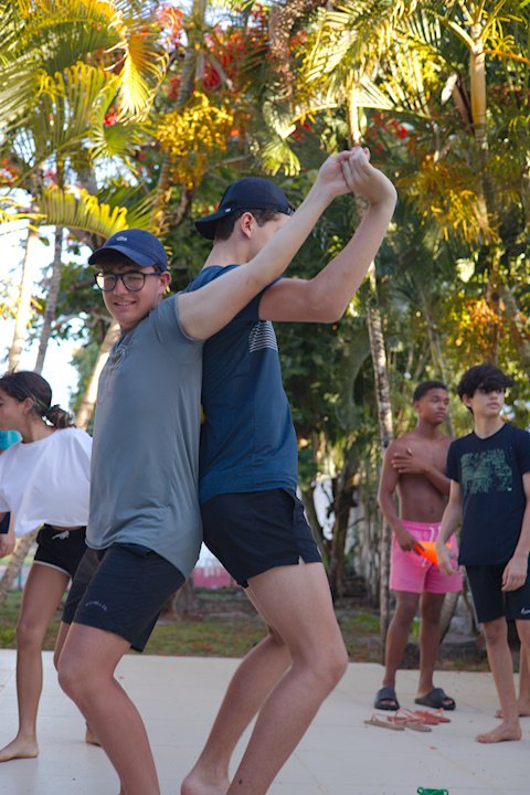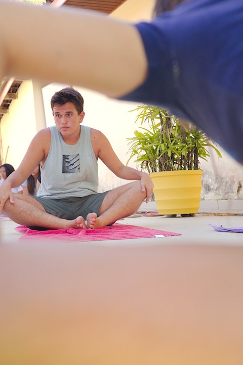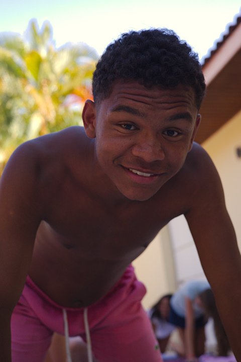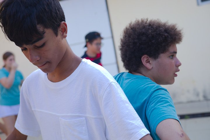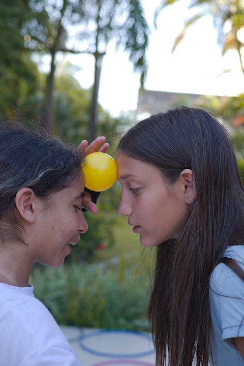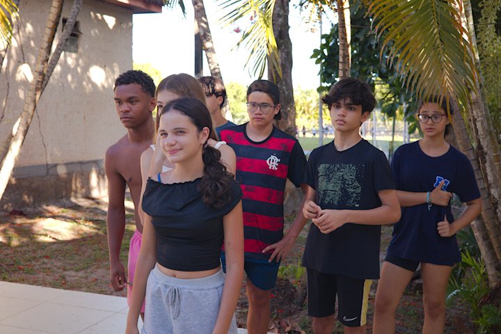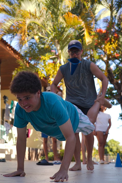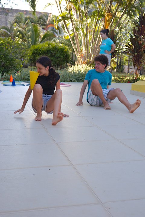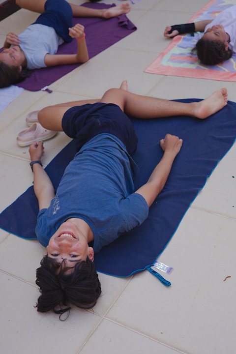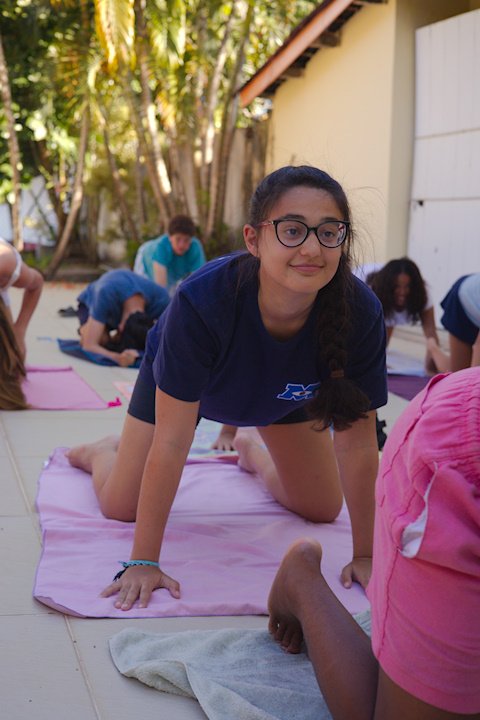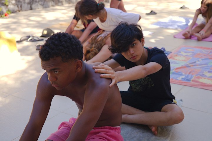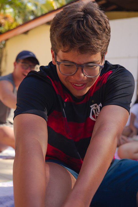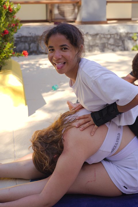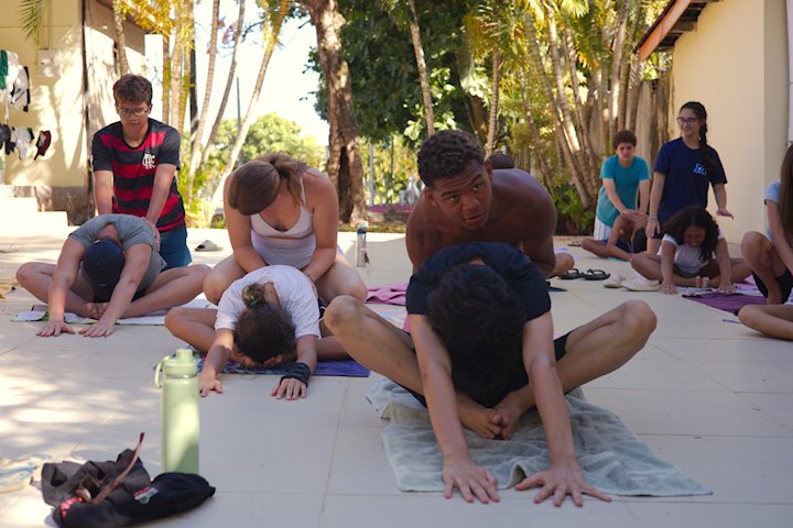 Hora de alongar o esqueleto. Kaya N’gan Daya, depois de se preparar fisicamente para a longa jornada vivida no Jogo de Vilas que está por acontecer, focou na preparação espiritual. Antes da revolução, a calmaria. Fizeram uns minutinhos de alongamento e uma meditação com a ajuda de tia Luba e Bia, emprestadas do Navio Pirata. Agora sim estão prontos!