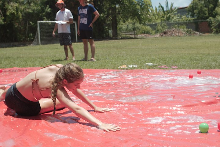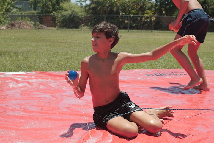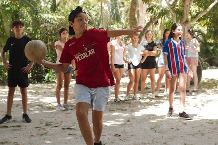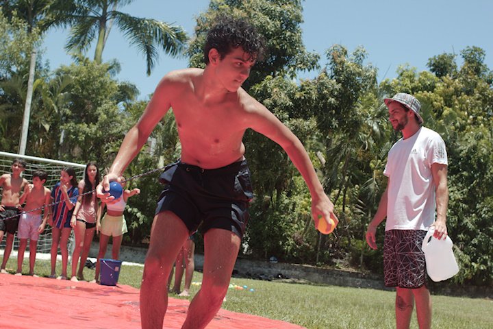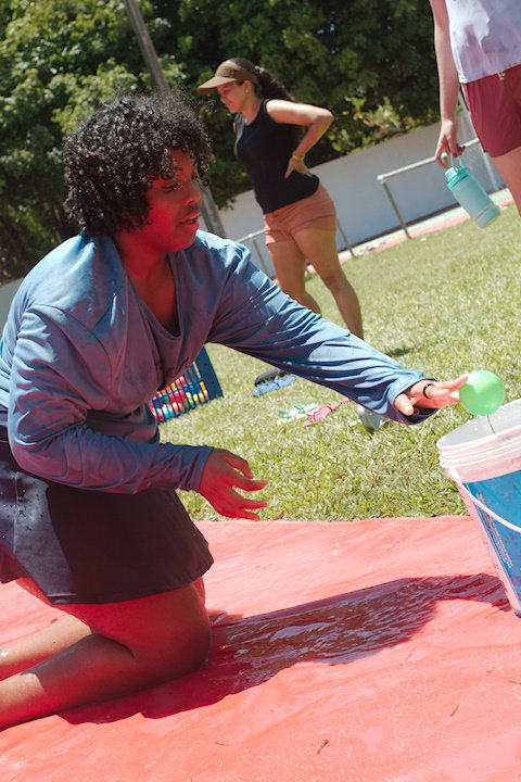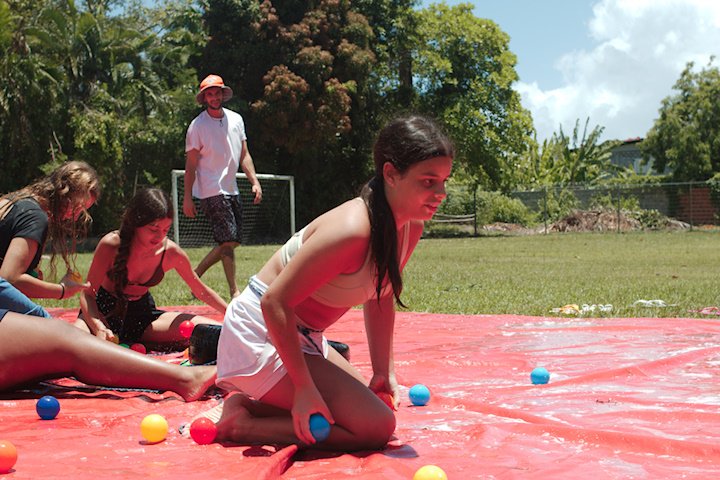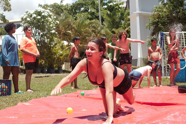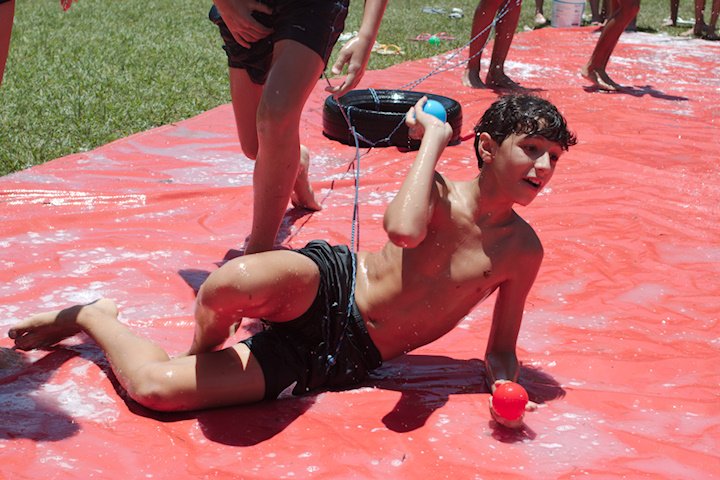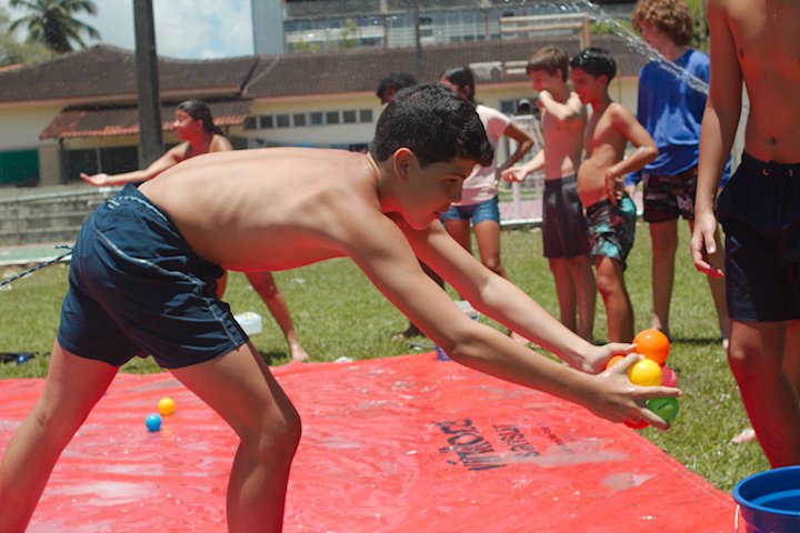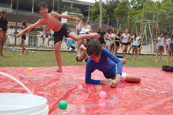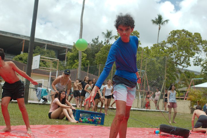 No segundo tempo, todos foram convocados para a queridinha das manhãs de sol escaldante: a lona! Unidos pela amizade e por cordas amarradas a um pneu, o objetivo das equipes era coletar o máximo de bolinhas possível, mas com muito cuidado para não deslizar e botar tudo a perder.