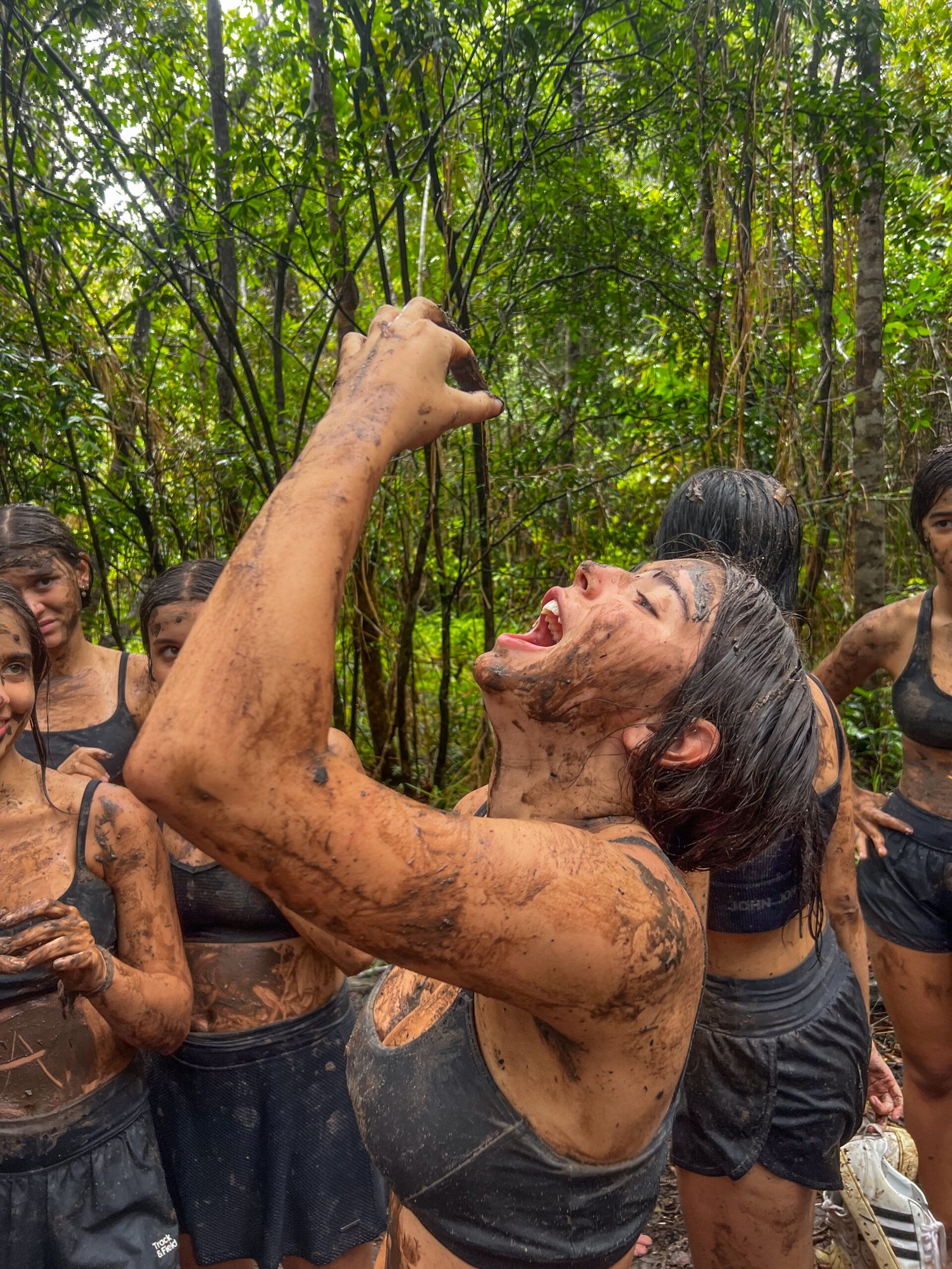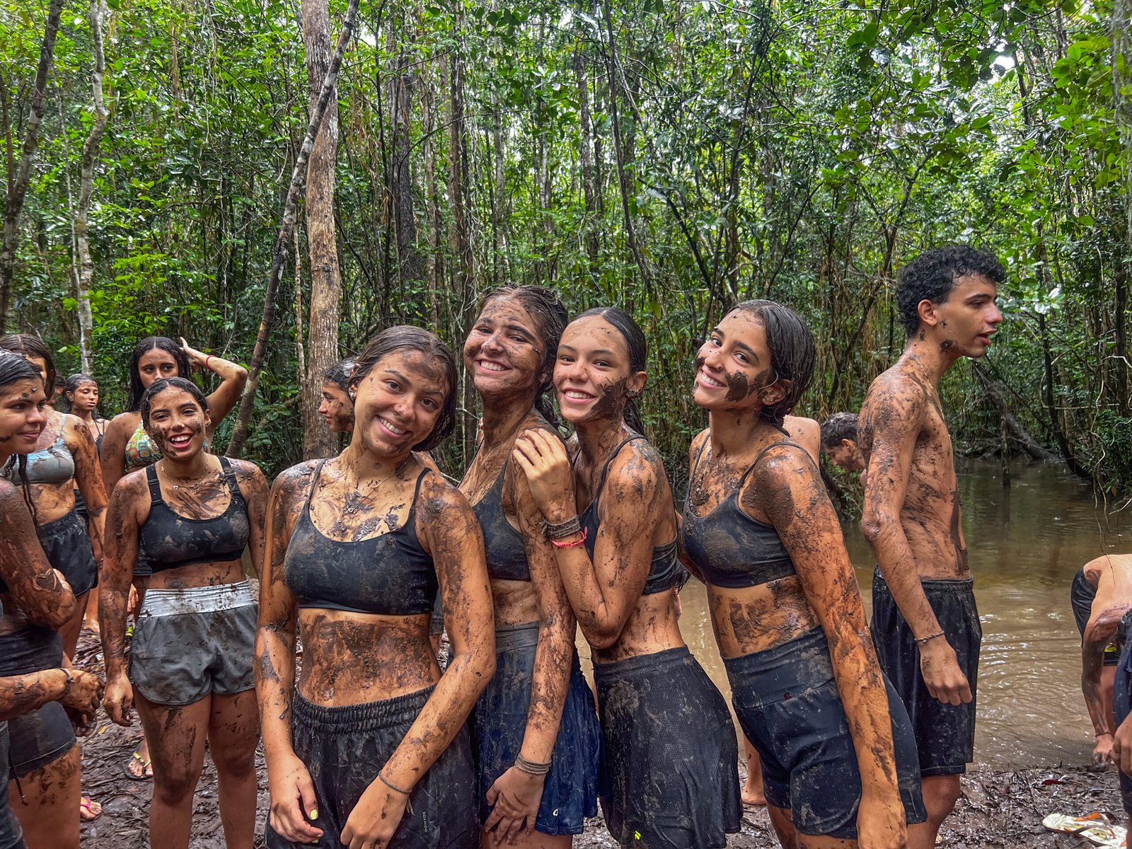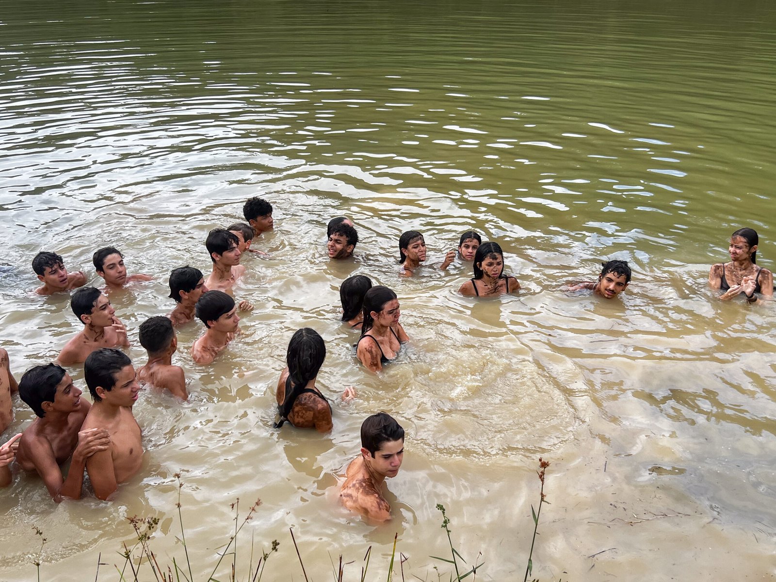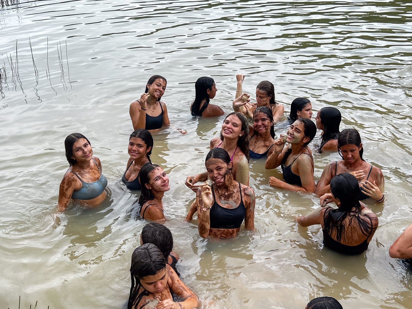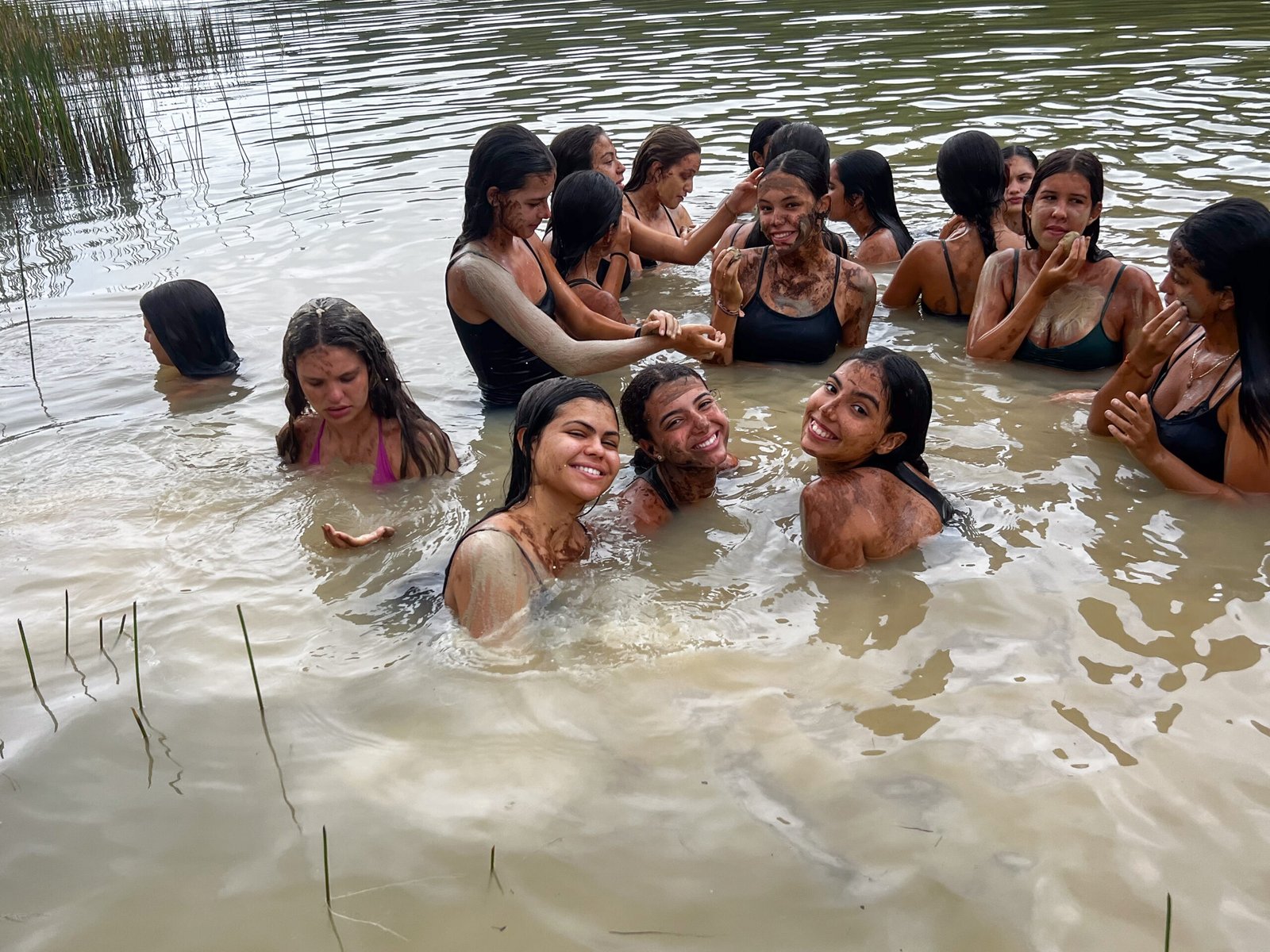 Pós noite de sono em barracas partiram cedo para uma aventura na trilha que os levou para uma guerra de lama! Mas tudo certo, faz parte da skincare, depois foi só se lavar na represa!