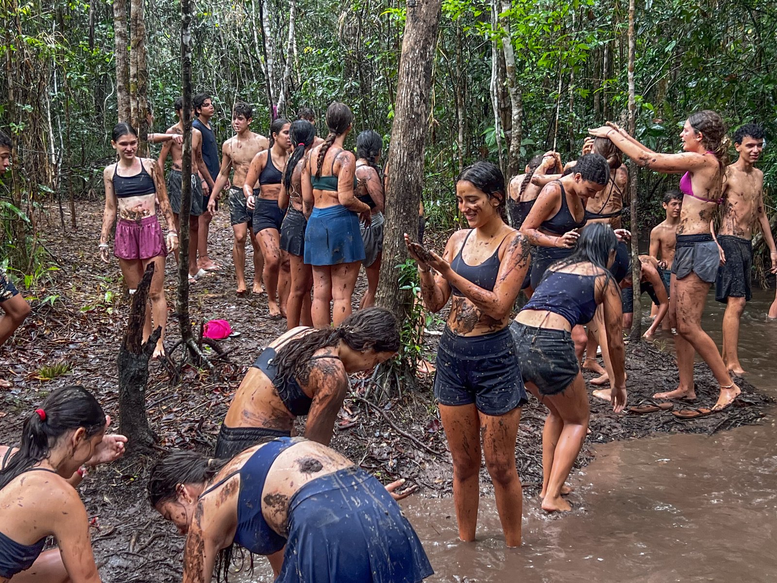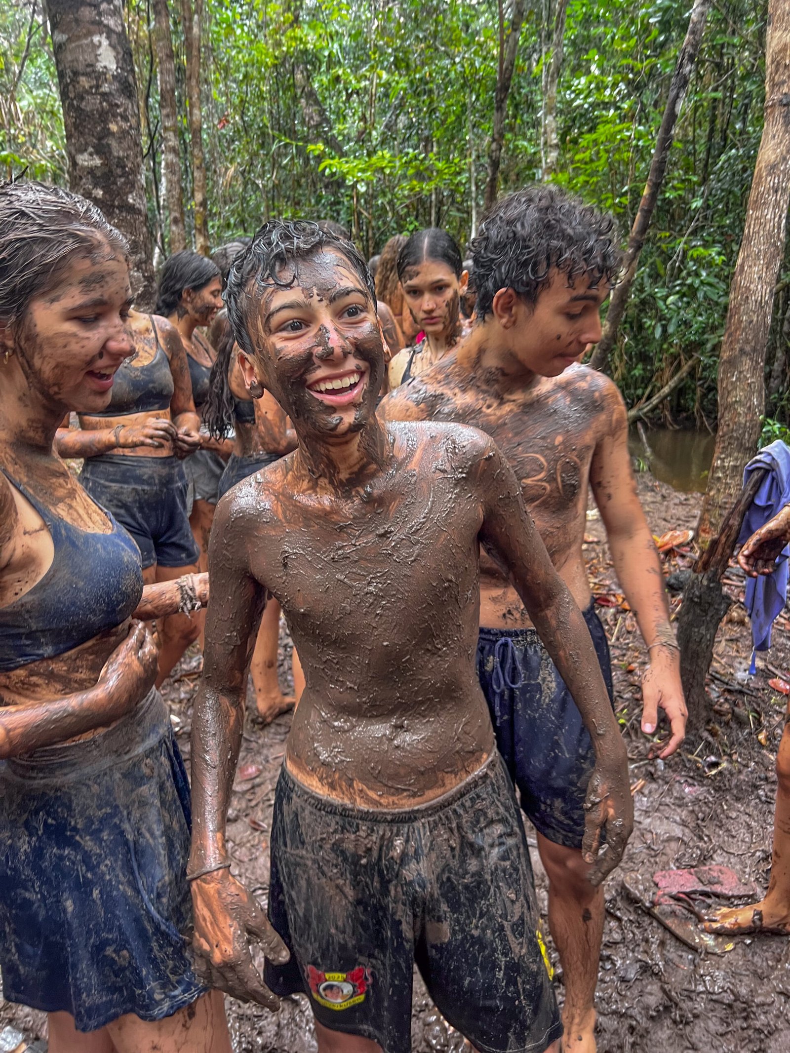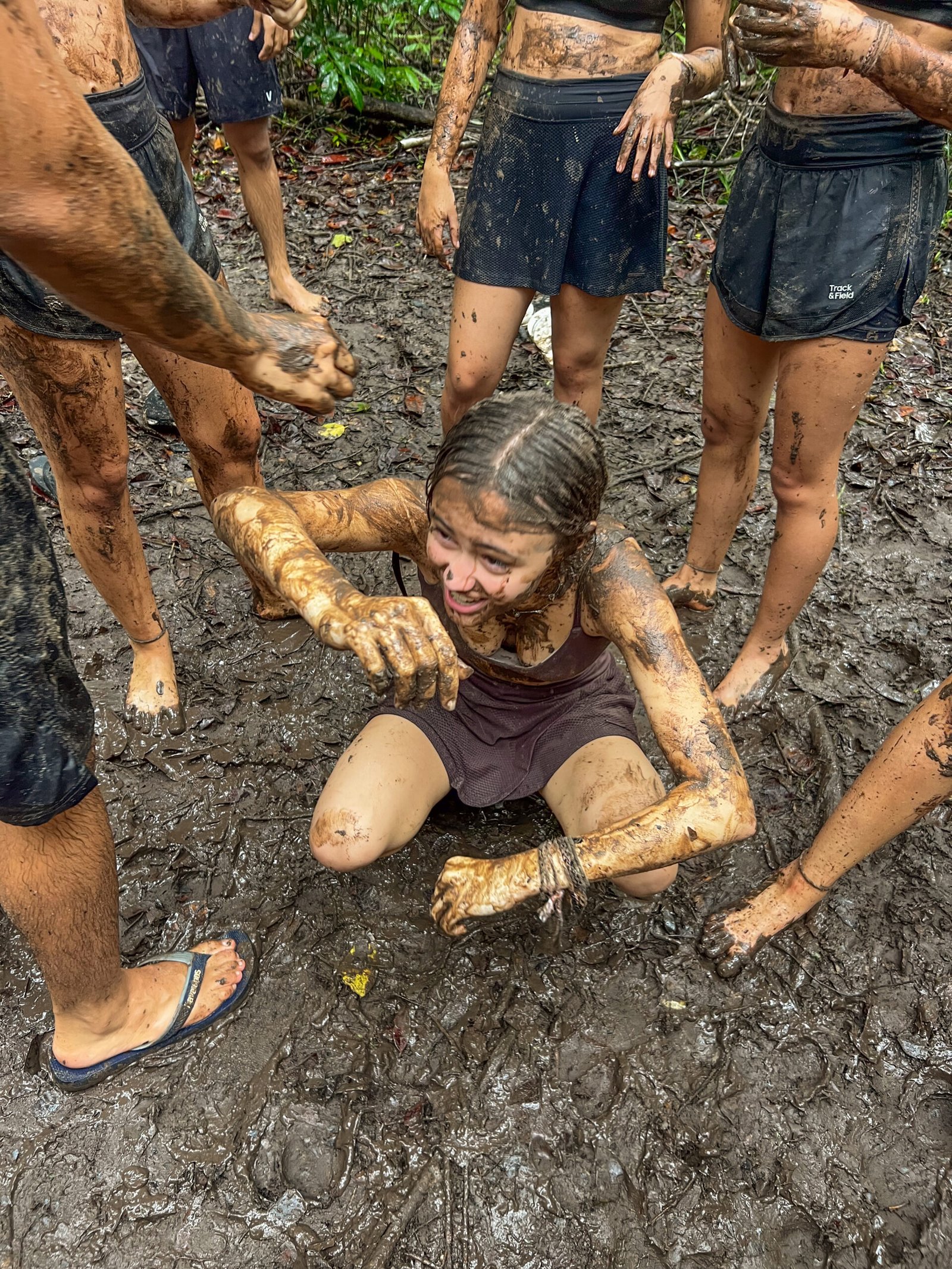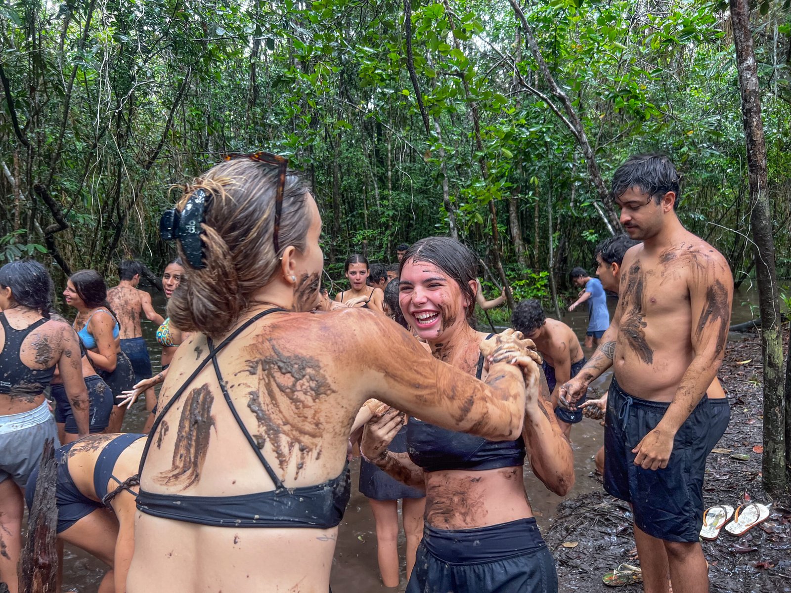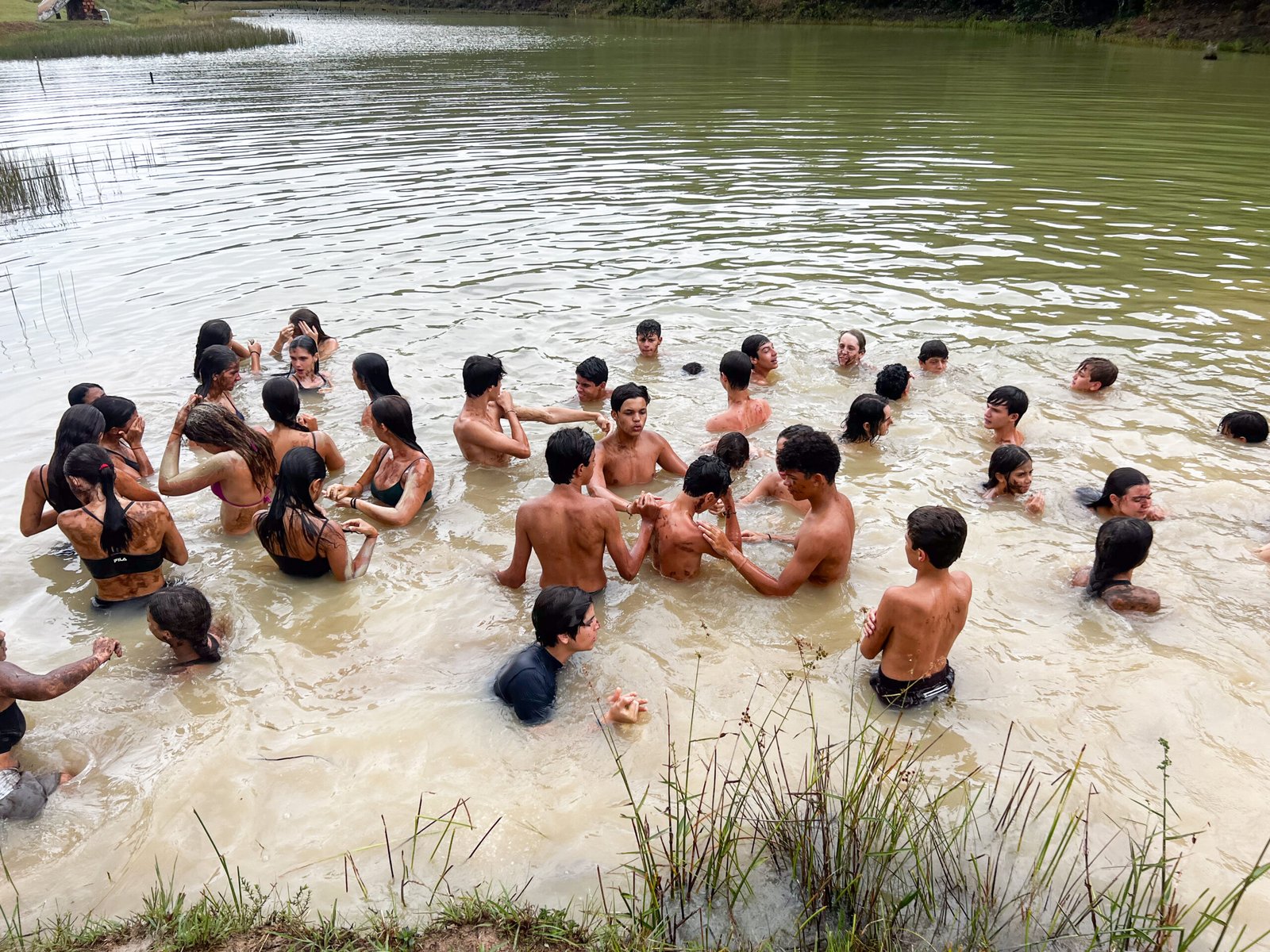 Pós noite de sono em barracas partiram cedo para uma aventura na trilha que os levou para uma guerra de lama! Mas tudo certo, faz parte da skincare, depois foi só se lavar na represa!