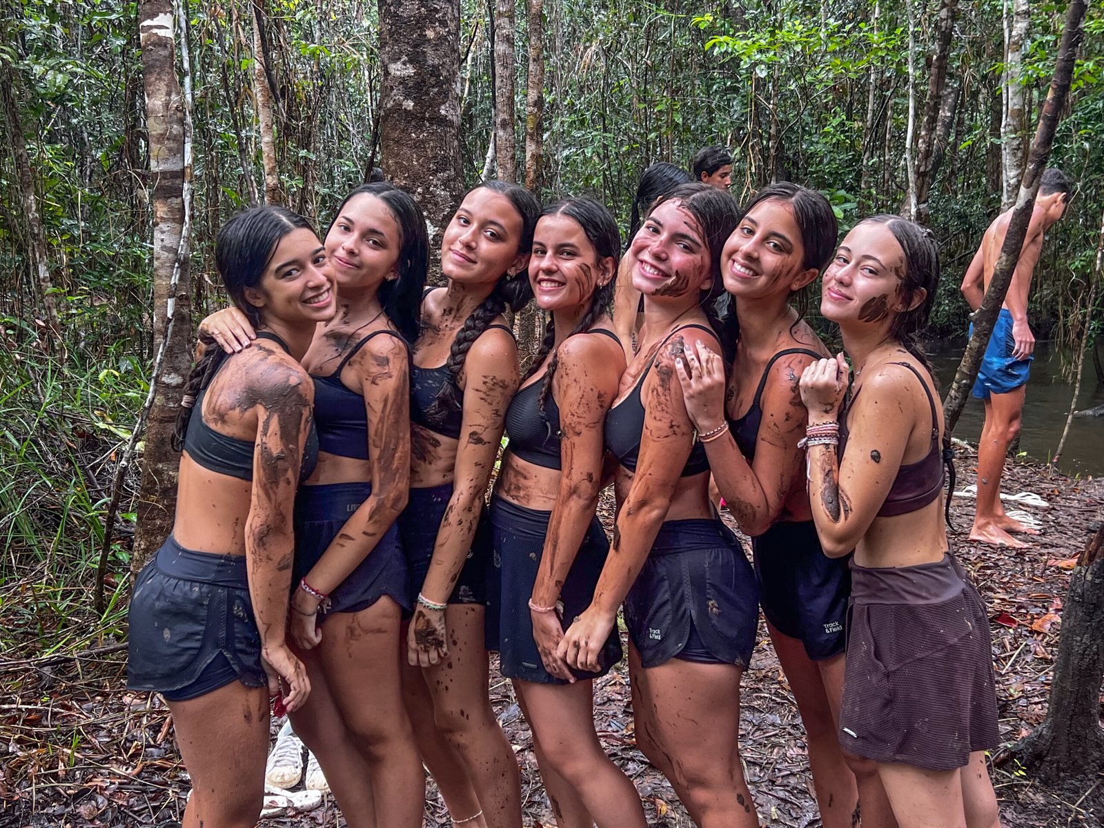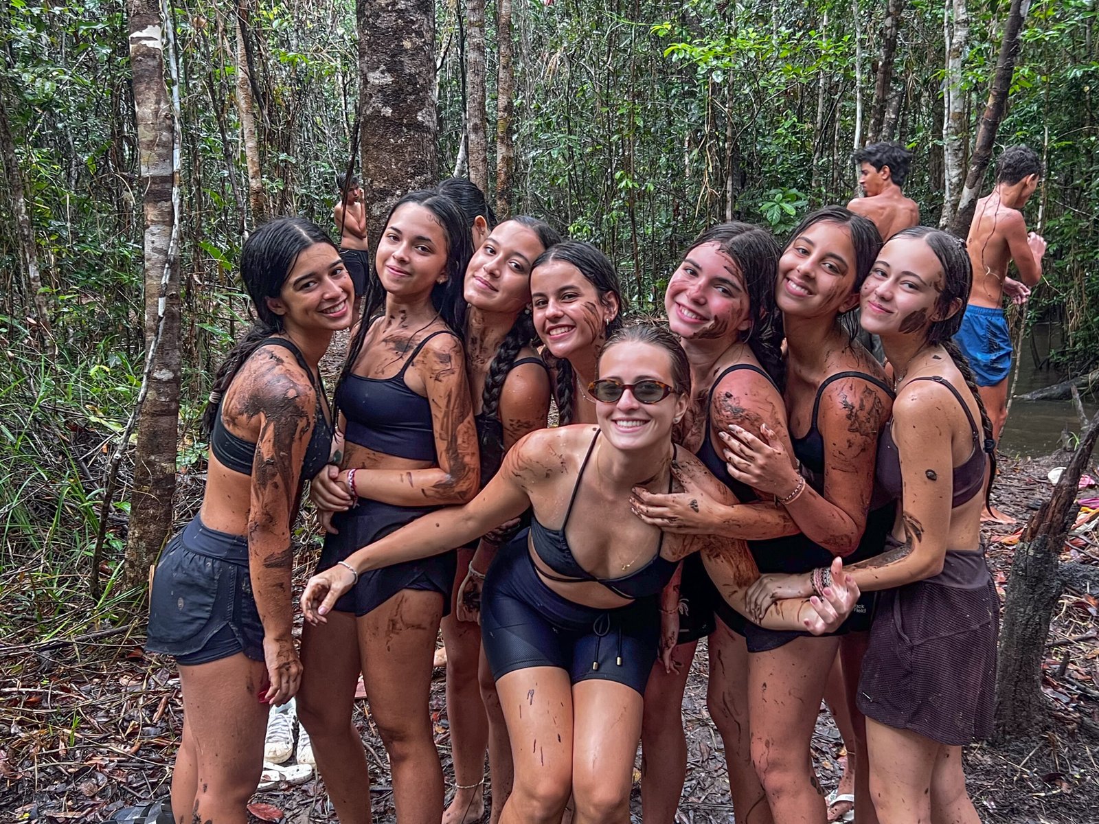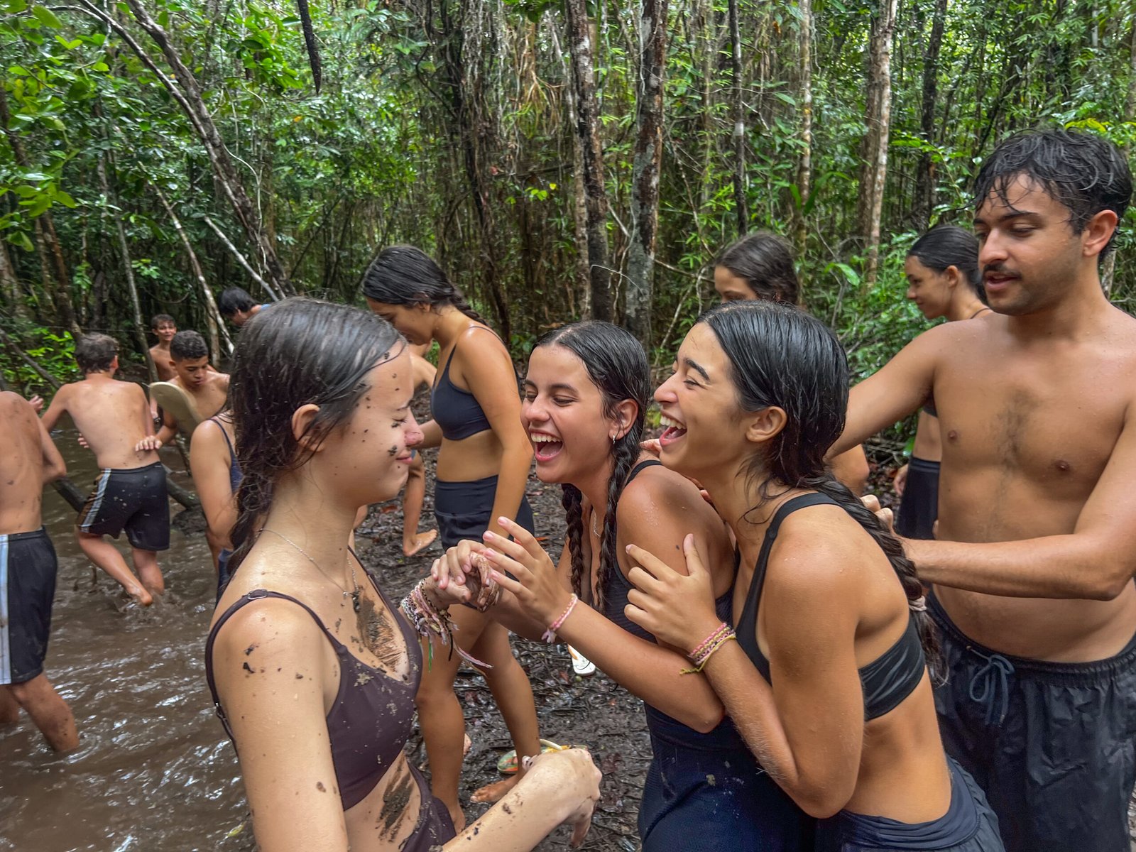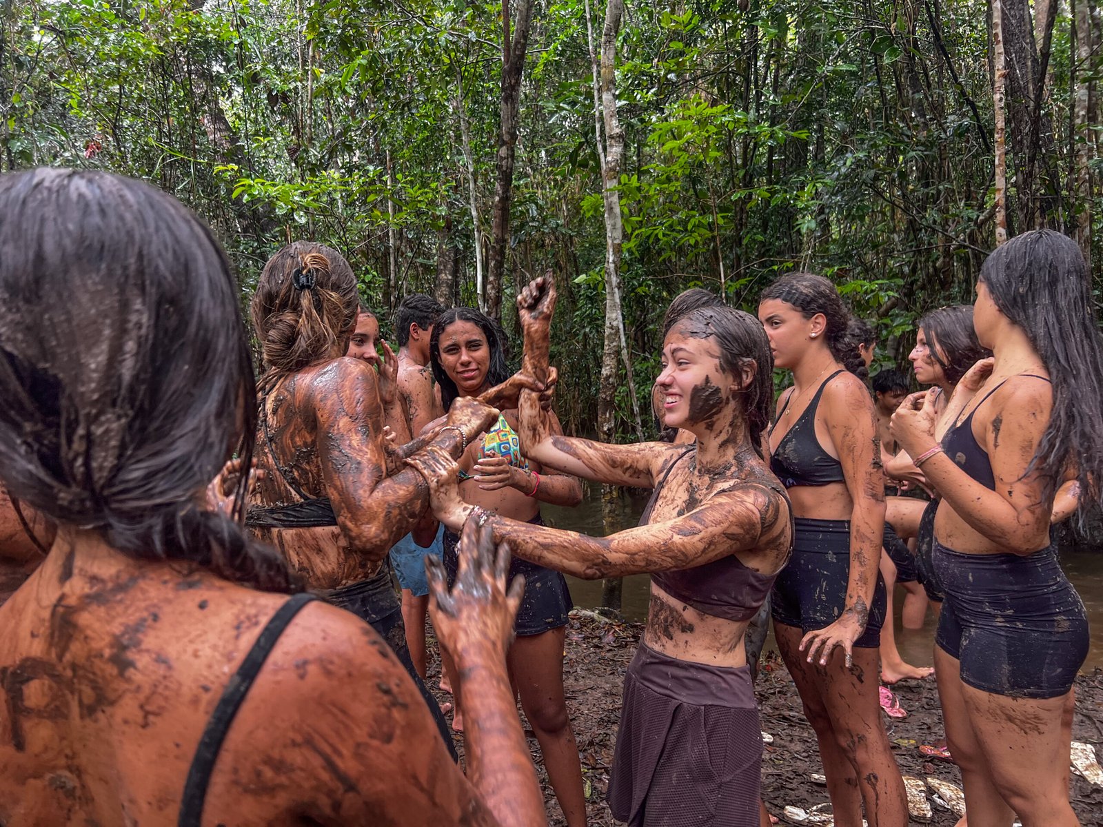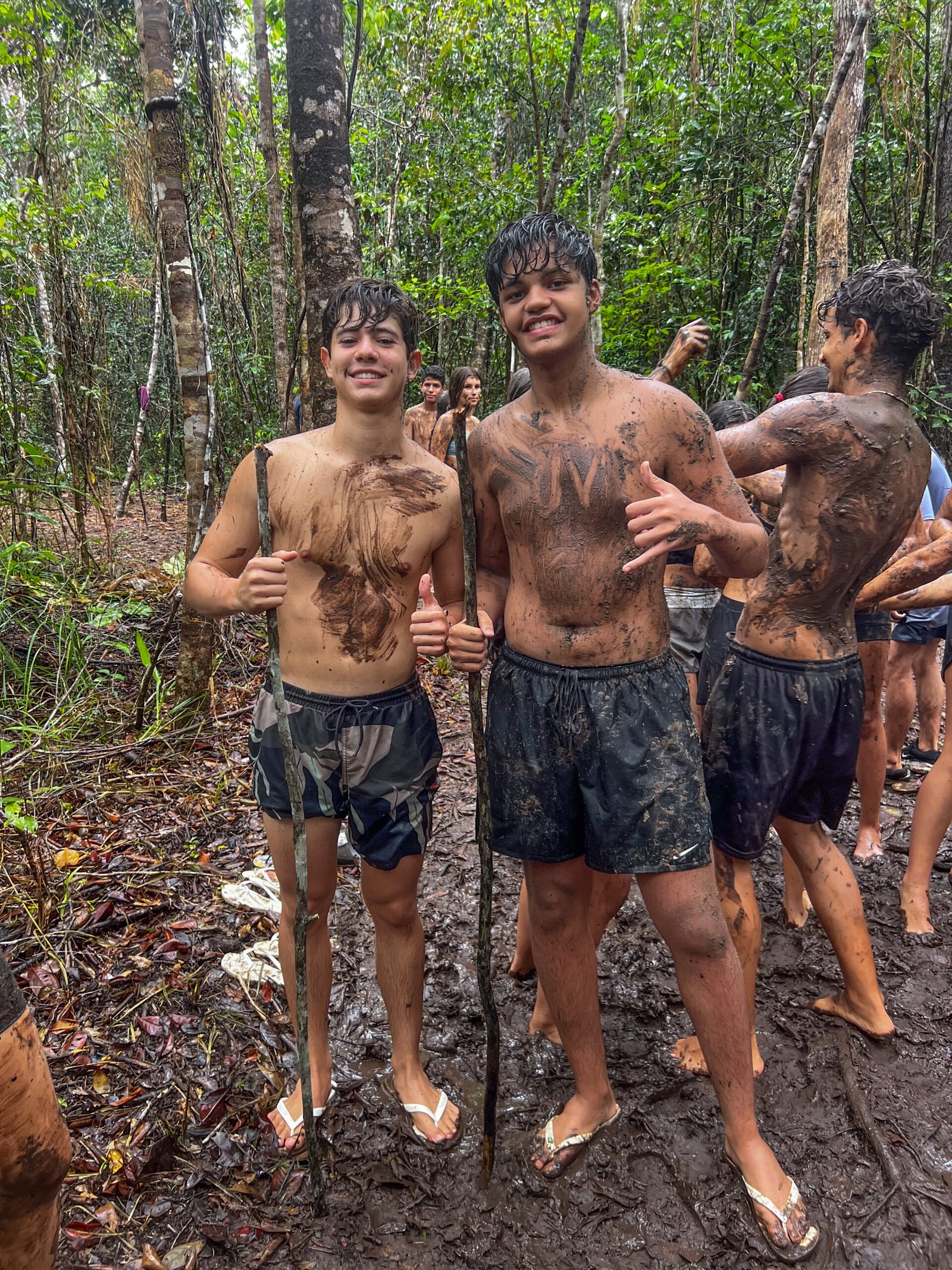 Pós noite de sono em barracas partiram cedo para uma aventura na trilha que os levou para uma guerra de lama! Mas tudo certo, faz parte da skincare, depois foi só se lavar na represa!