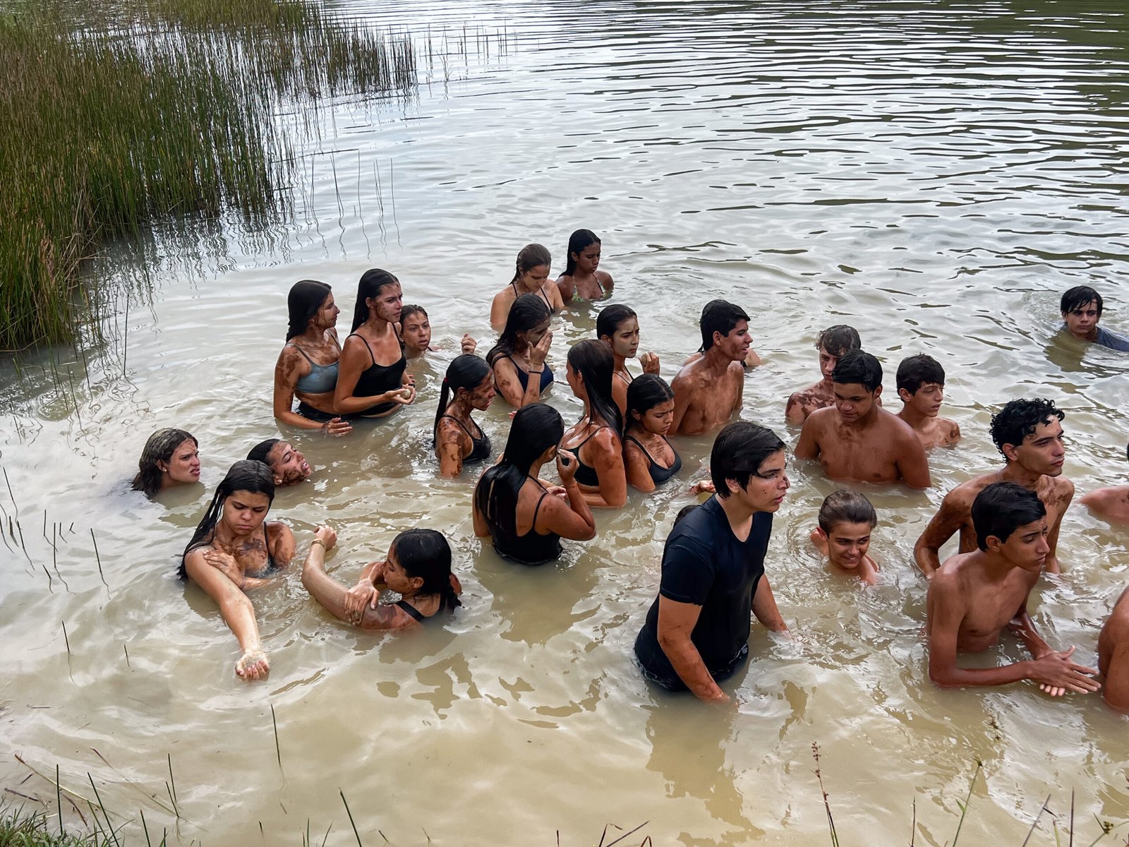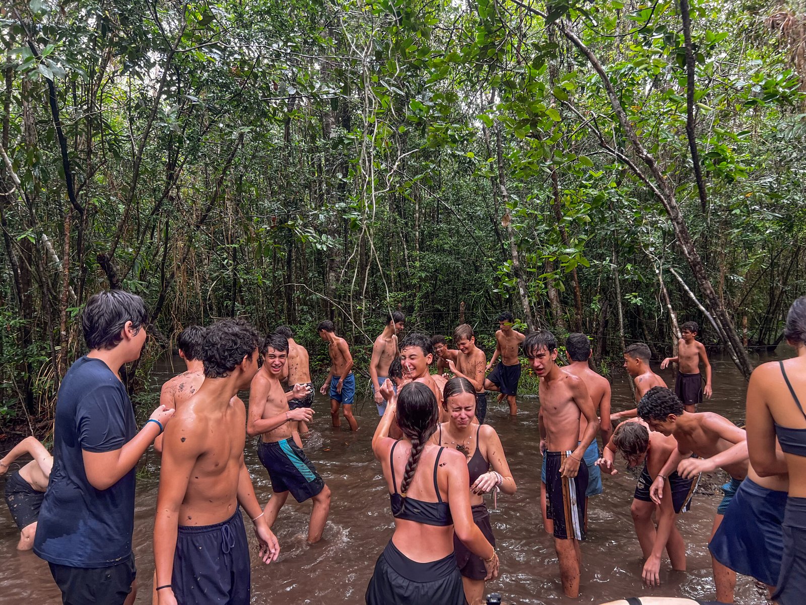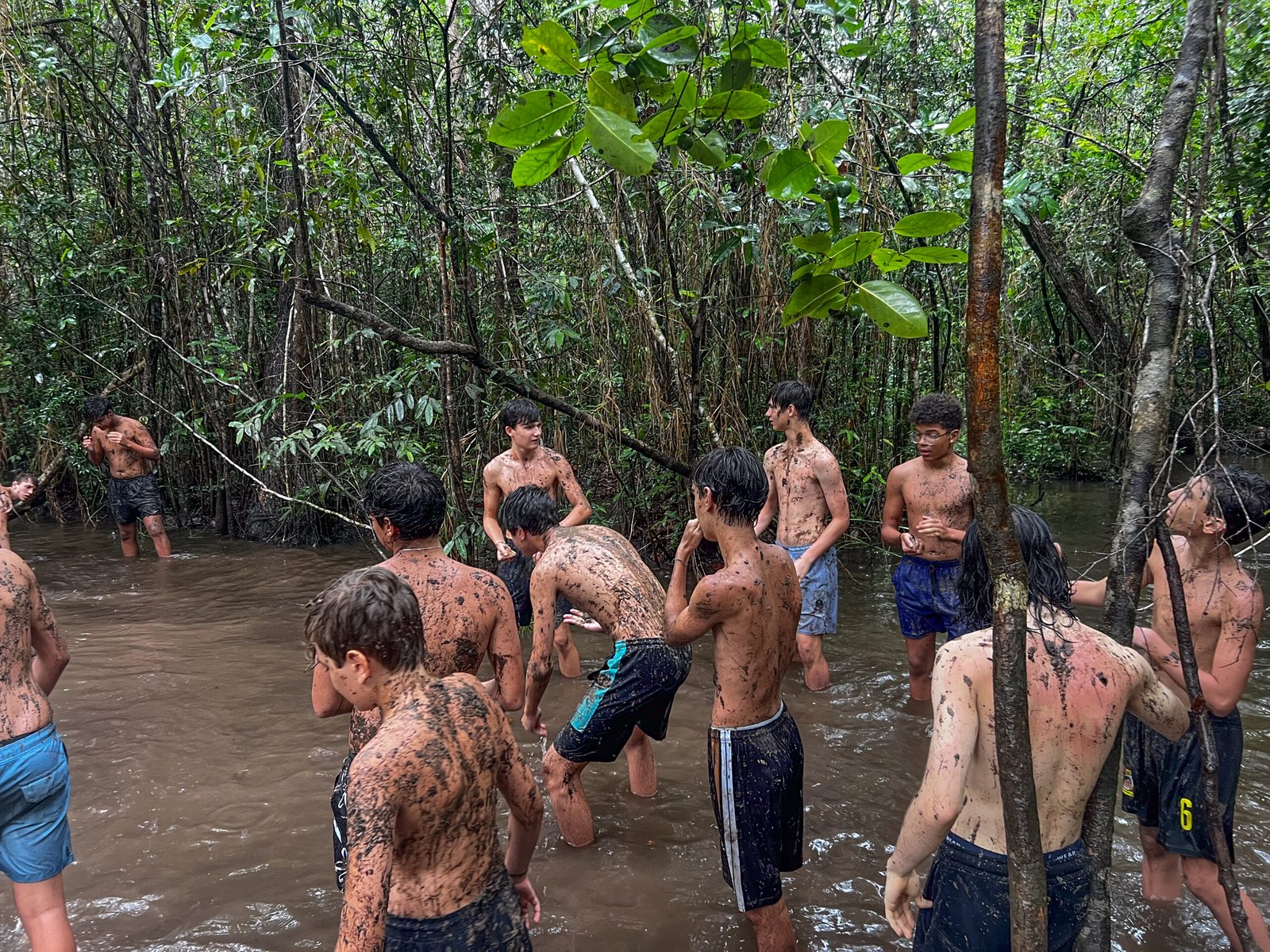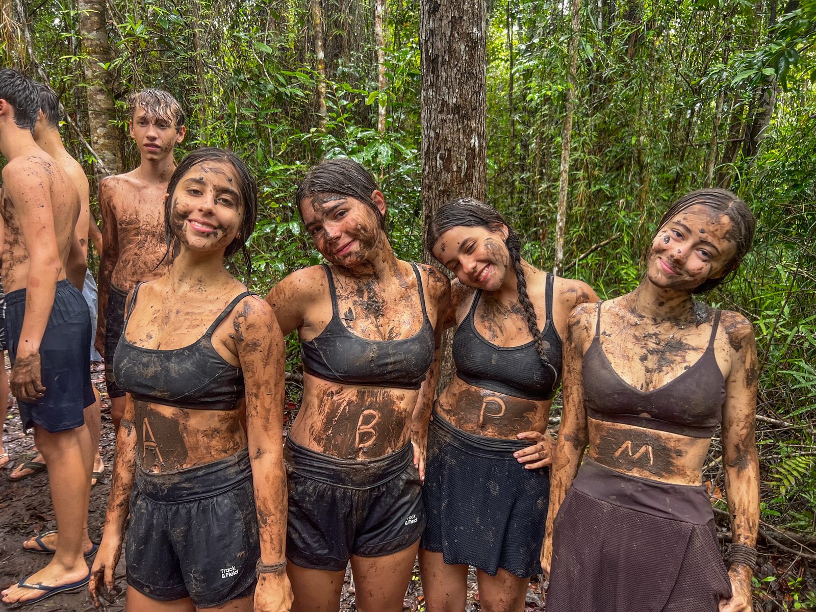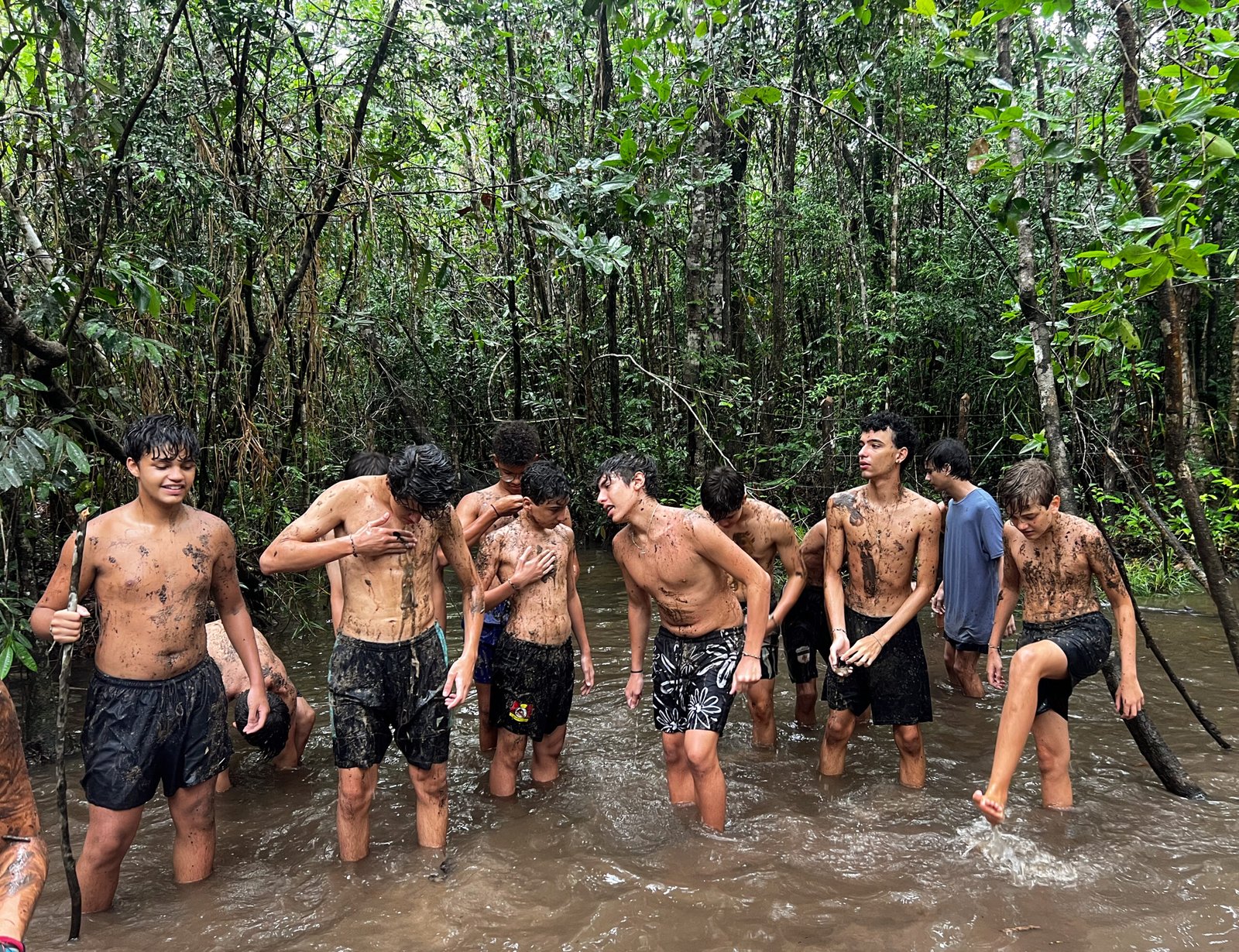 Pós noite de sono em barracas partiram cedo para uma aventura na trilha que os levou para uma guerra de lama! Mas tudo certo, faz parte da skincare, depois foi só se lavar na represa!