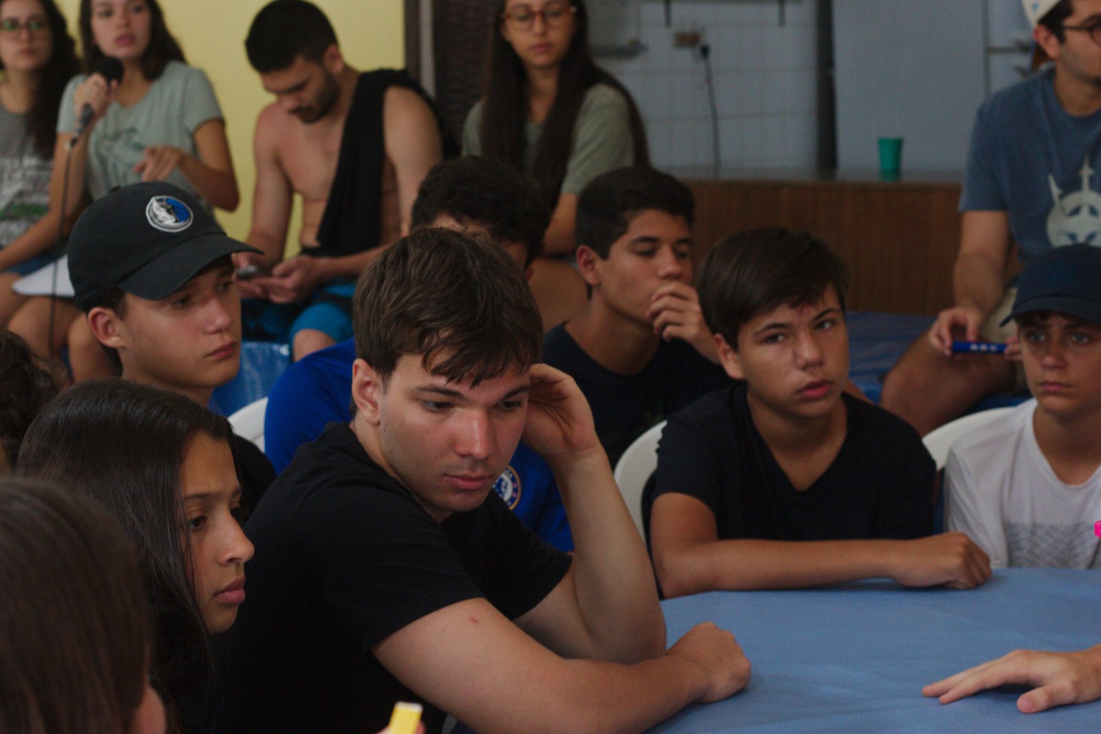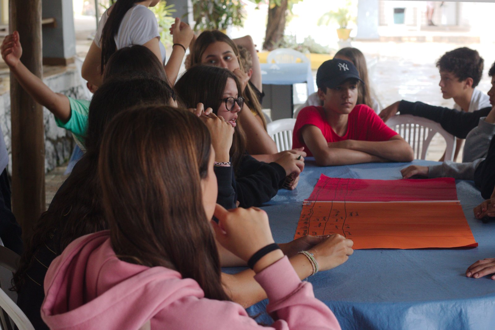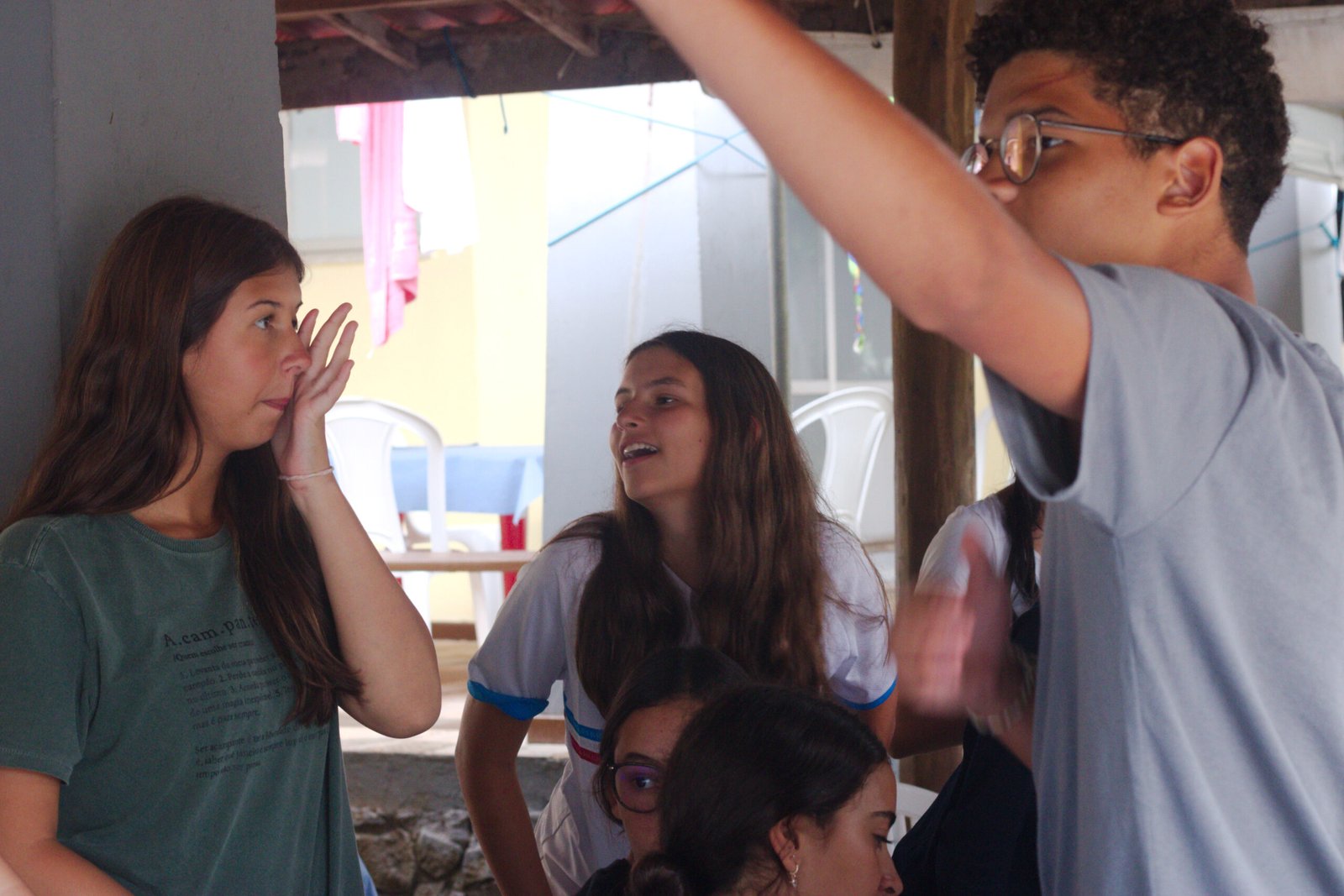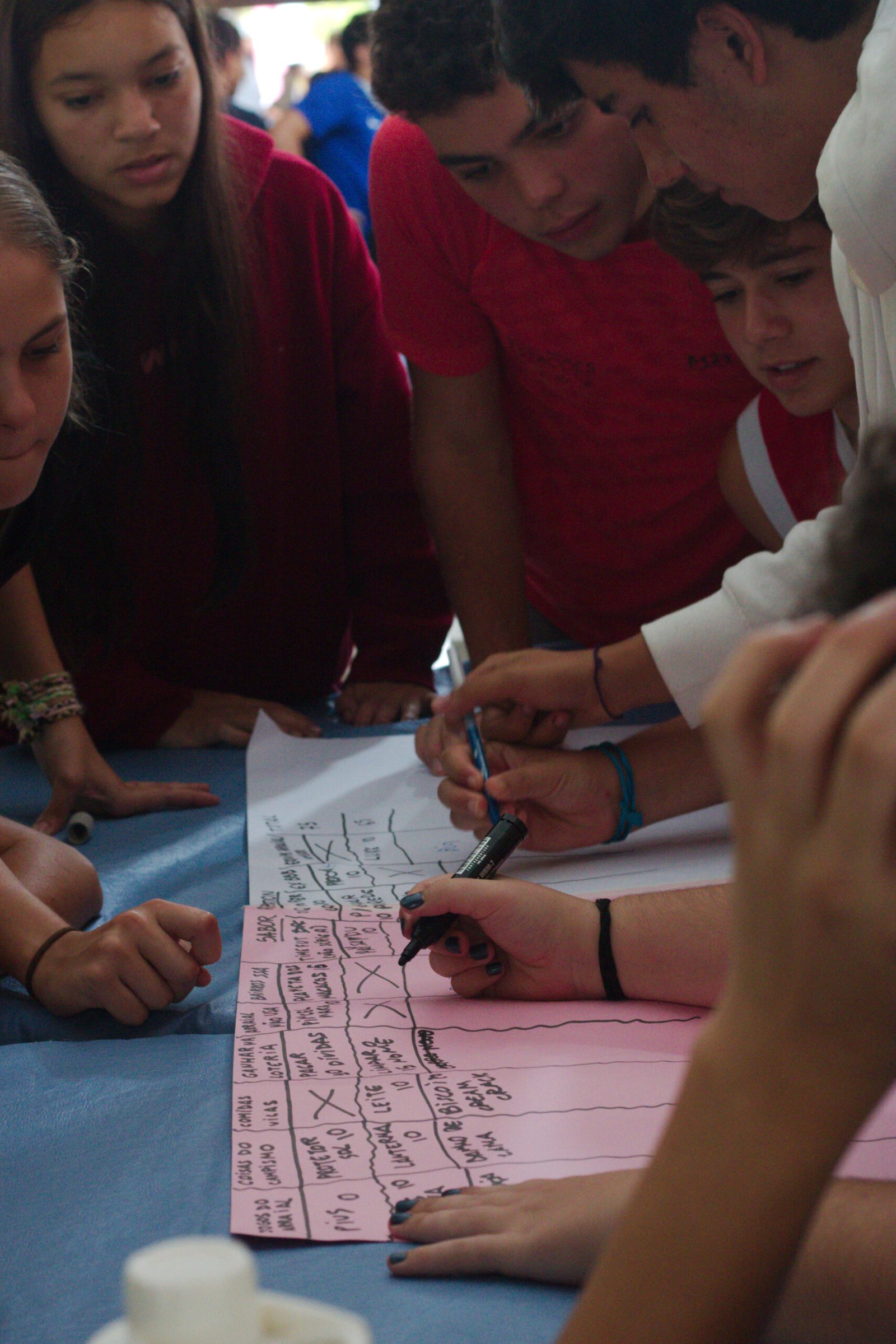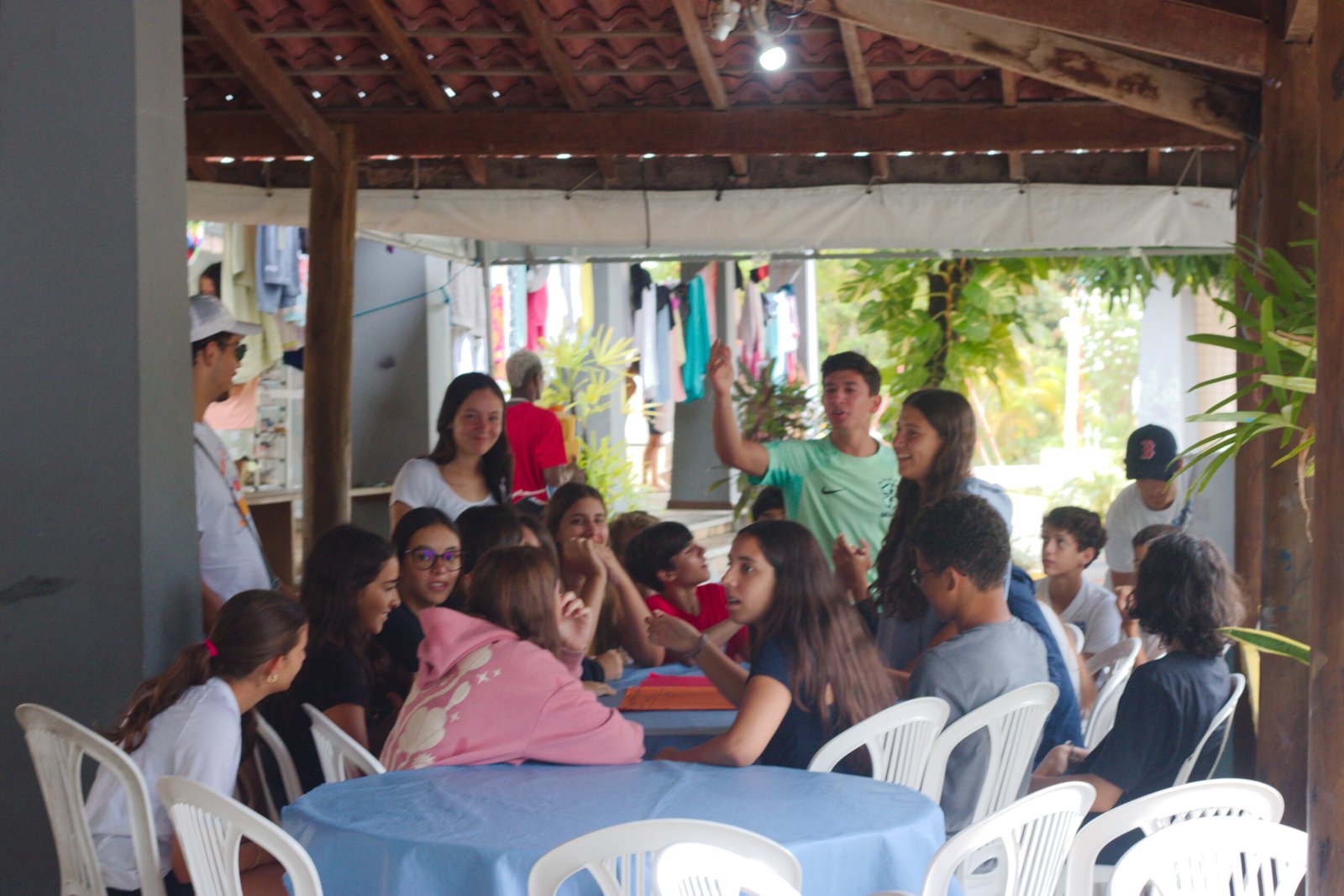 Amanheceu chovendo canivetes no Arraial, nem parece que é verão… Nesse climinha frio e lamacento não dava para correr pelo sítio, afinaaaaal, não queremos que seus filhotes gripem! Por isso, reunimos os dois grupões mais velhos do acampamento e jogamos todo mundo no refeitório para uma batalha de Stop Gigante!