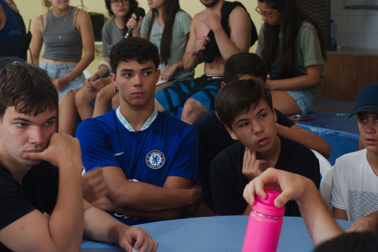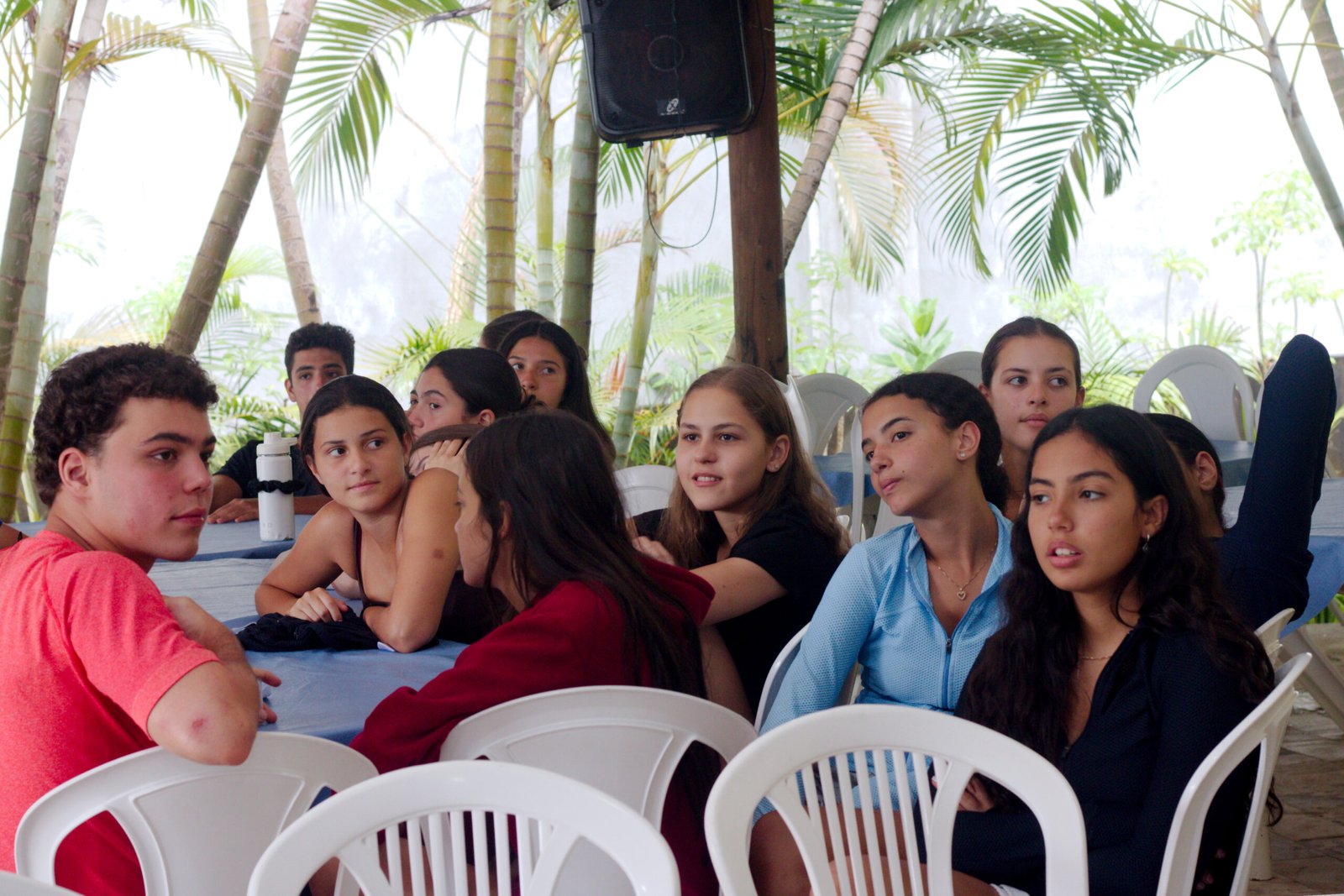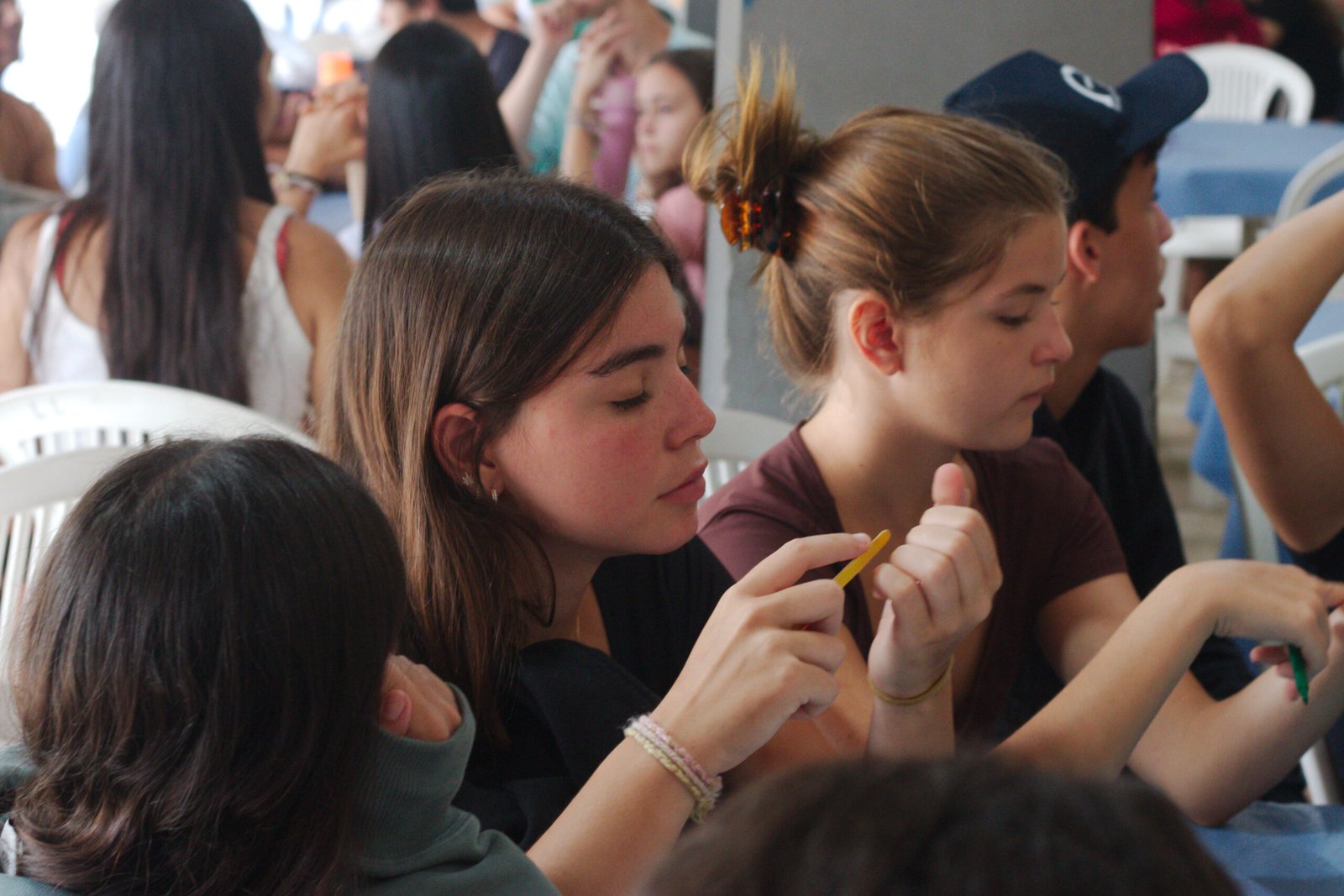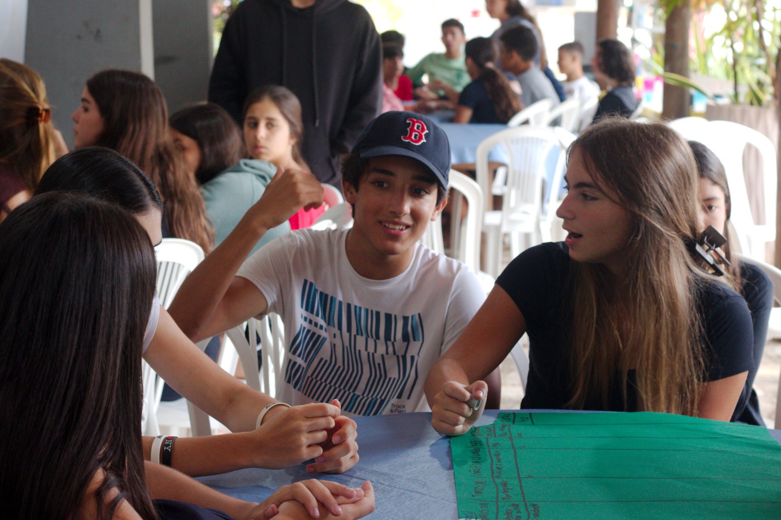 Amanheceu chovendo canivetes no Arraial, nem parece que é verão… Nesse climinha frio e lamacento não dava para correr pelo sítio, afinaaaaal, não queremos que seus filhotes gripem! Por isso, reunimos os dois grupões mais velhos do acampamento e jogamos todo mundo no refeitório para uma batalha de Stop Gigante!