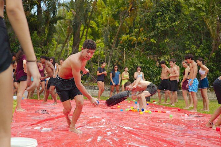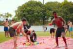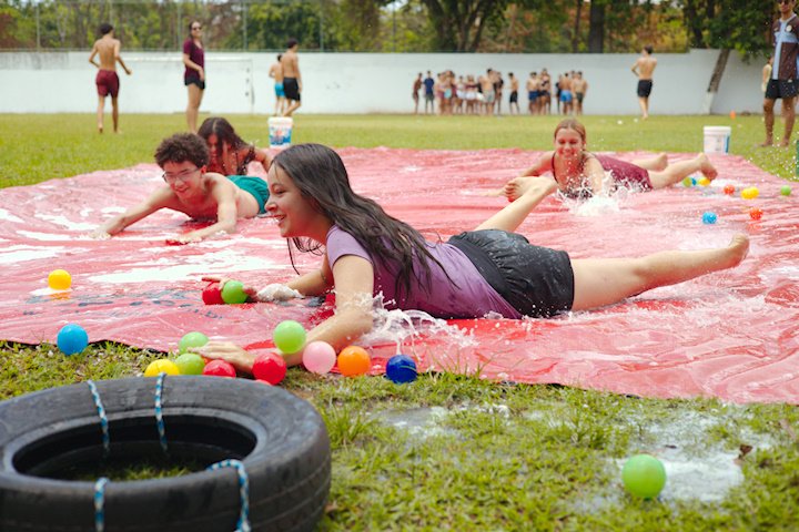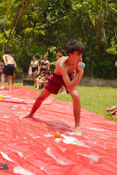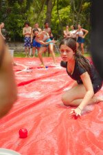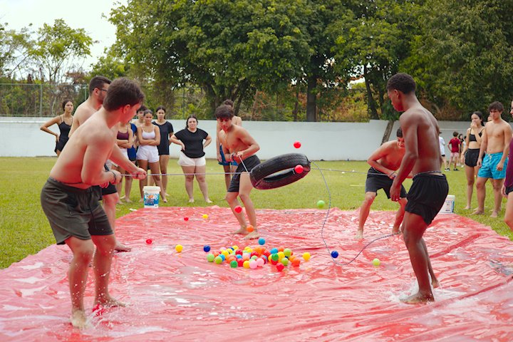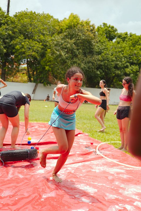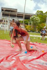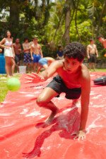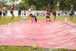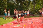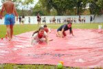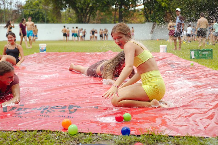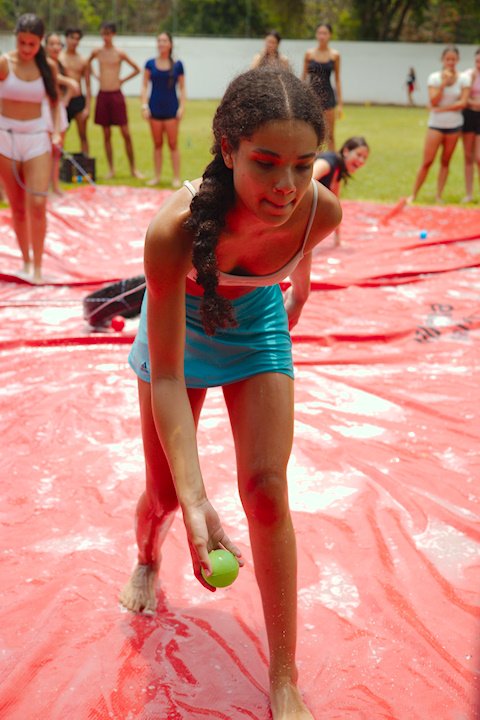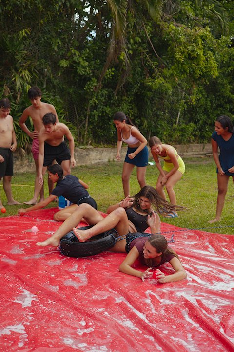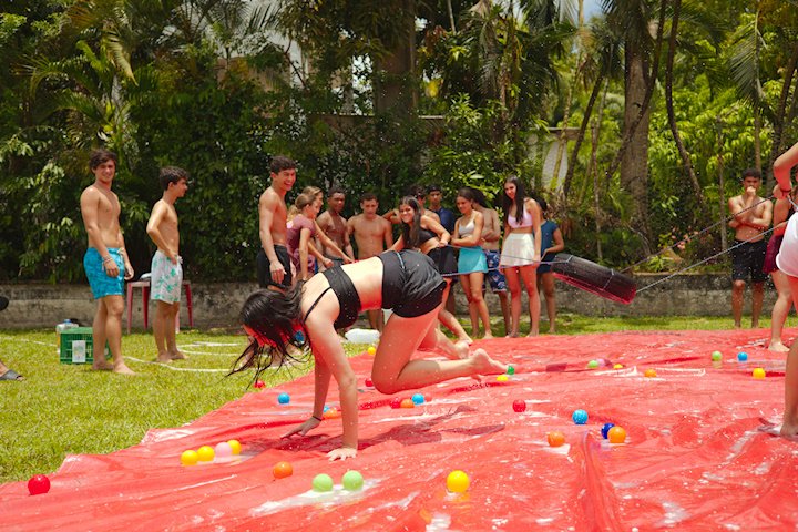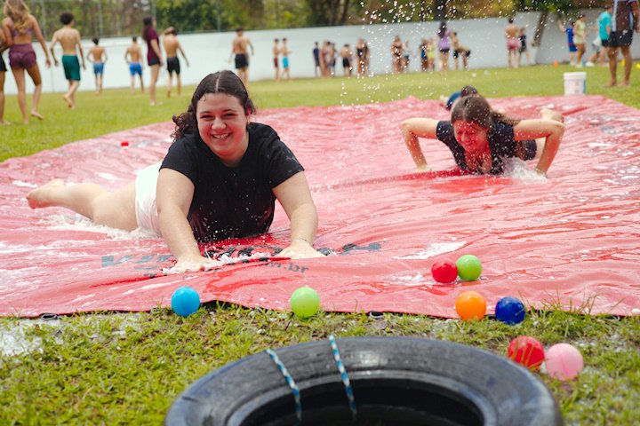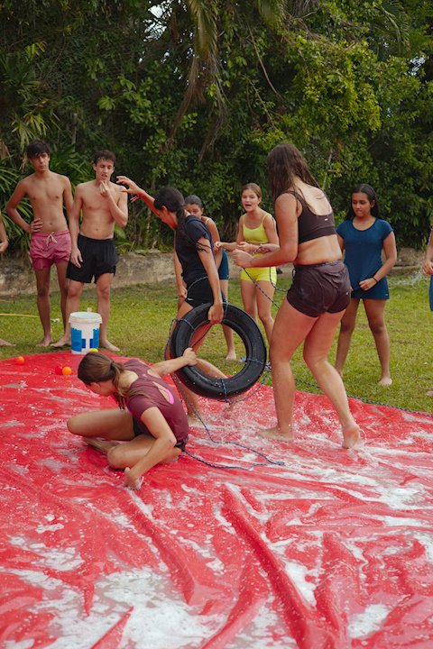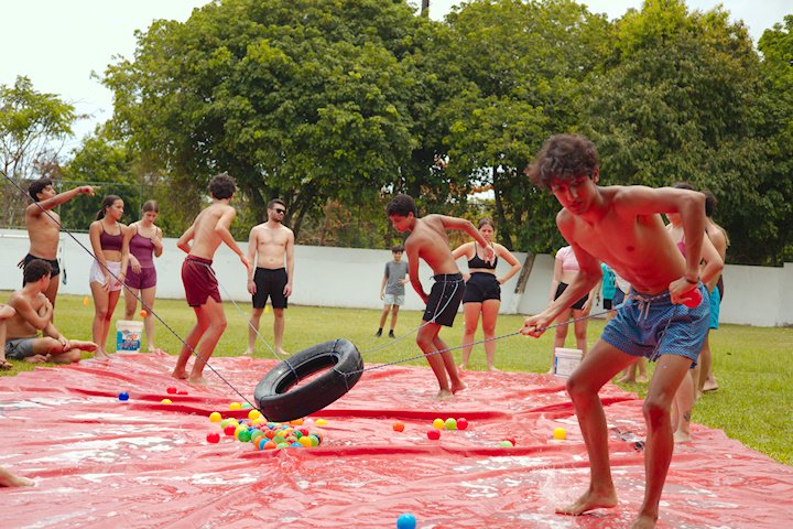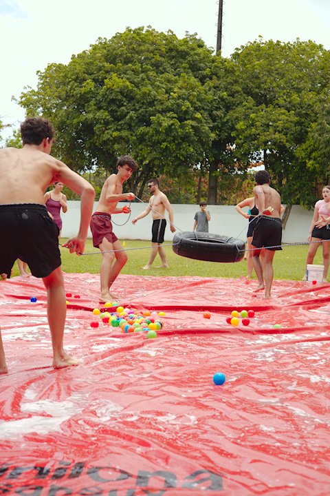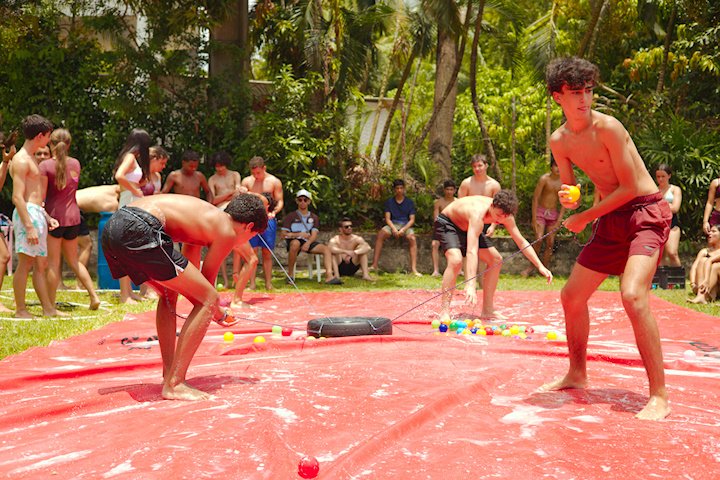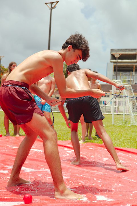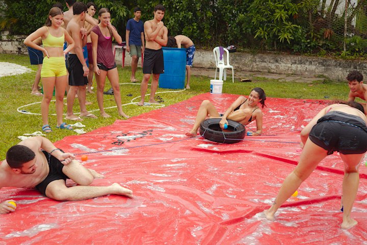 E outra, e mais outra. Esses Carcará são duros na queda. Caem, mas levantam de novo como se nada tivesse acontecido. Hoje foi dia de Lona 2.0! Uma reedição da brincadeira sobre uma lona de sabão, acrescentando um nível de dificuldade: amarrados um contra o outro, precisam levar bolinhas para encher seu balde. Não sem tomar um escorregão e ser arrastado deslizando até o lado contrário do que precisa.