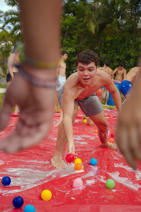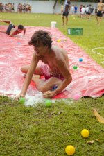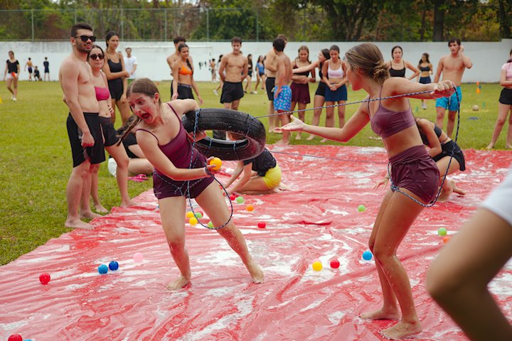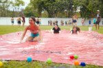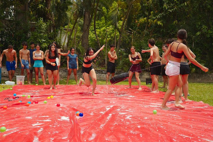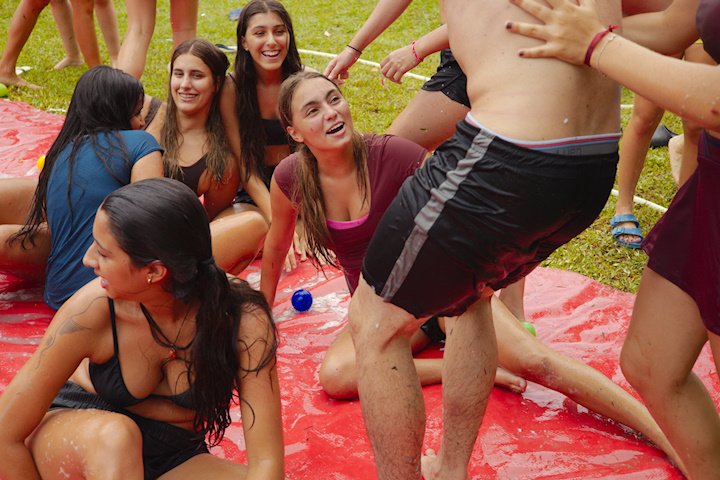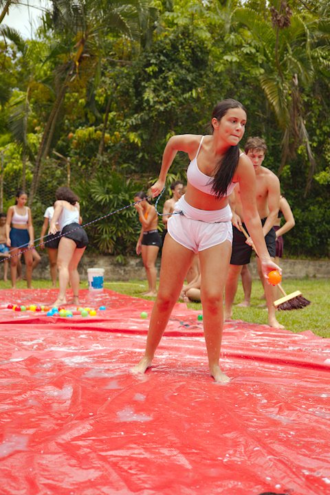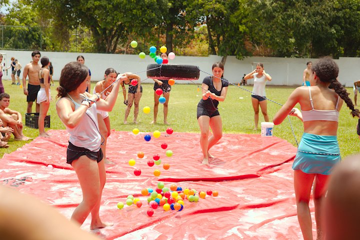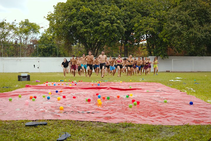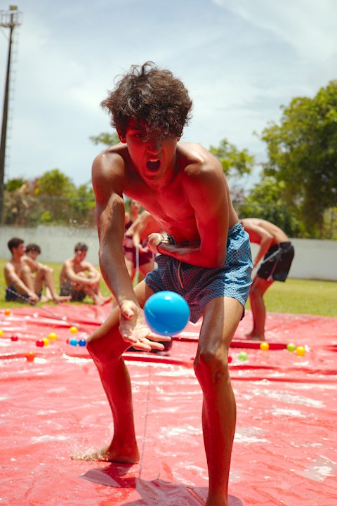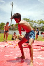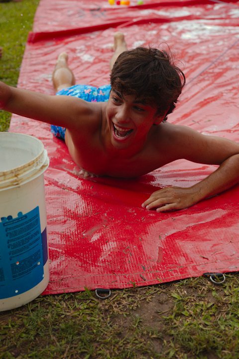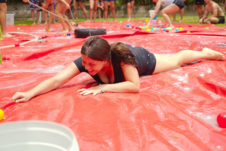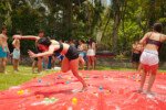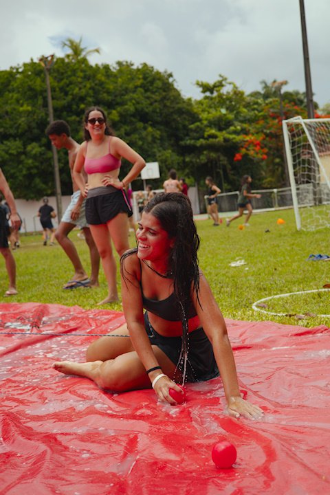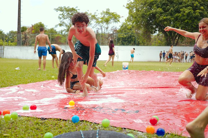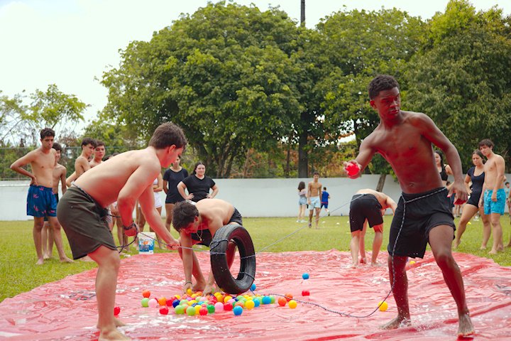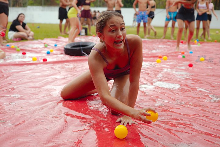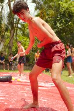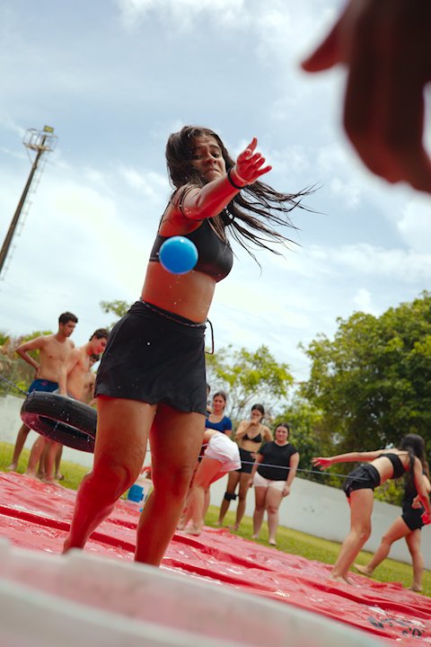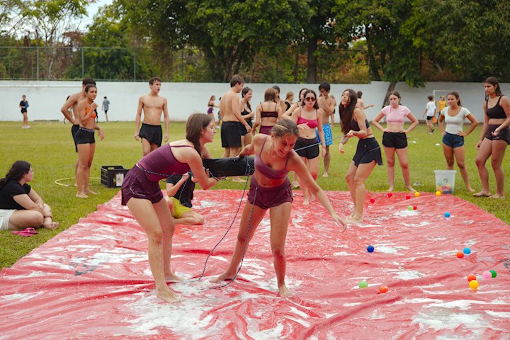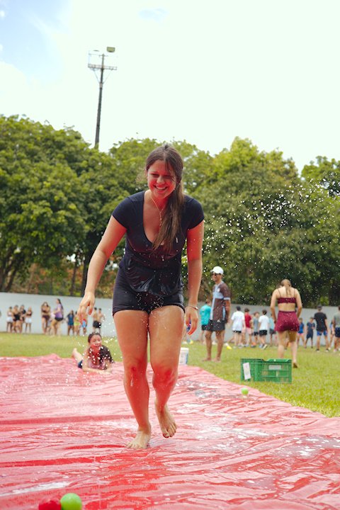 E outra, e mais outra. Esses Carcará são duros na queda. Caem, mas levantam de novo como se nada tivesse acontecido. Hoje foi dia de Lona 2.0! Uma reedição da brincadeira sobre uma lona de sabão, acrescentando um nível de dificuldade: amarrados um contra o outro, precisam levar bolinhas para encher seu balde. Não sem tomar um escorregão e ser arrastado deslizando até o lado contrário do que precisa.