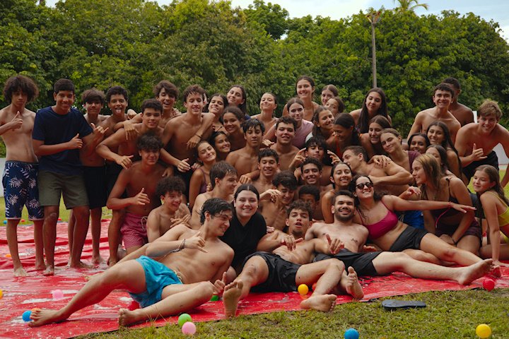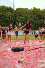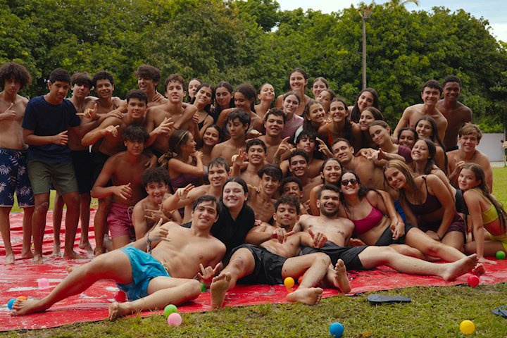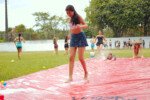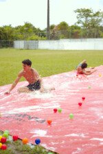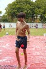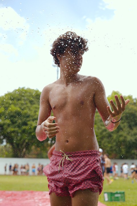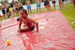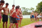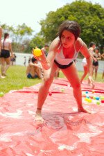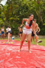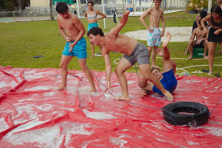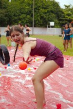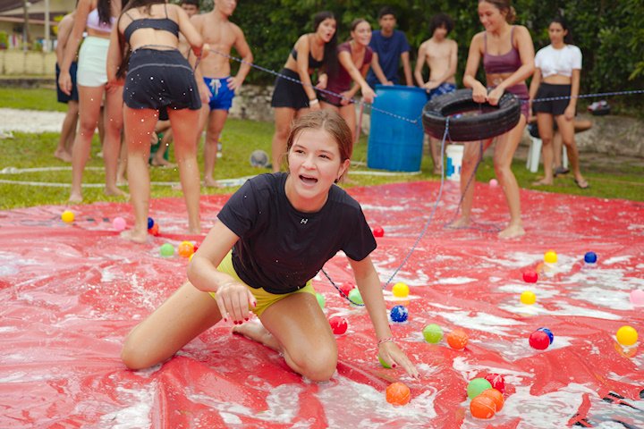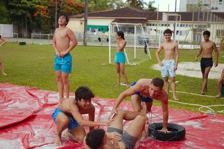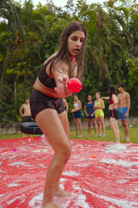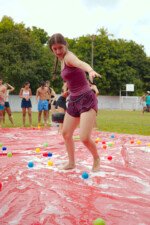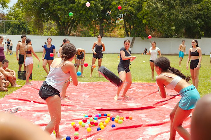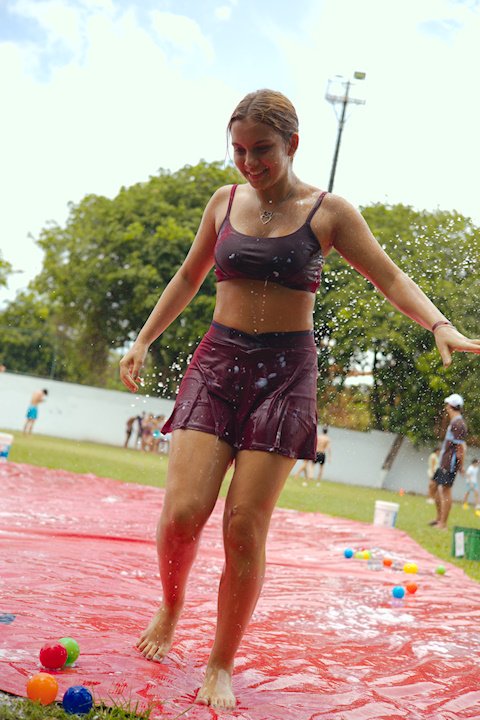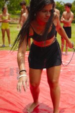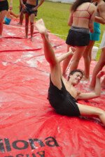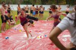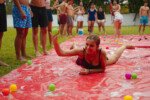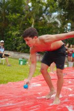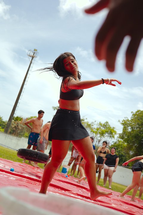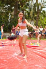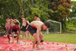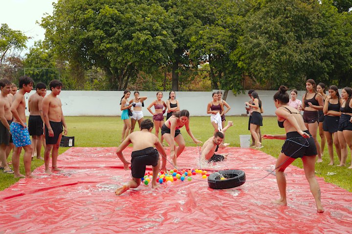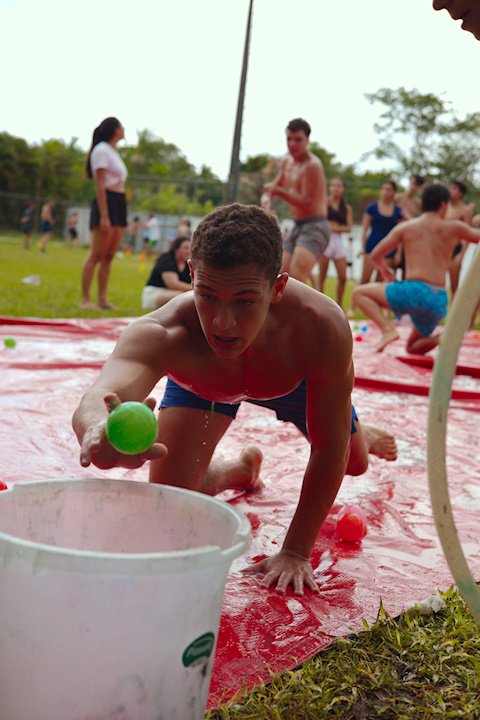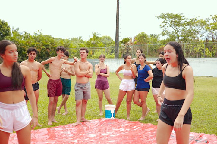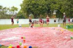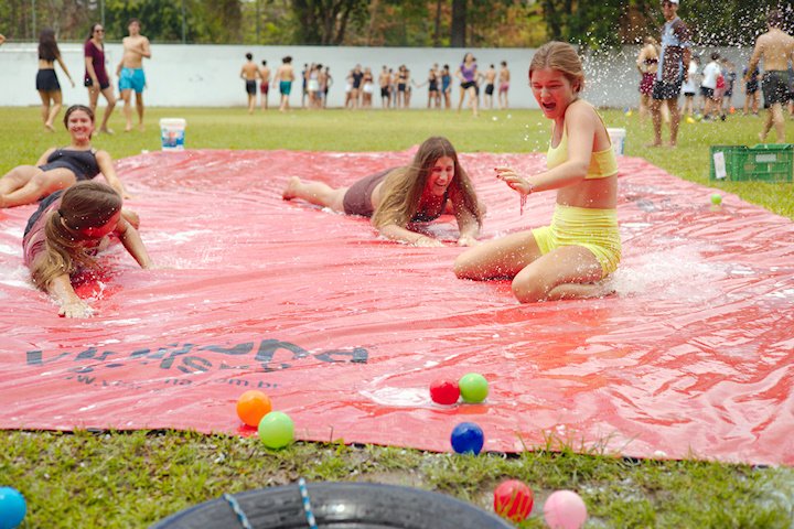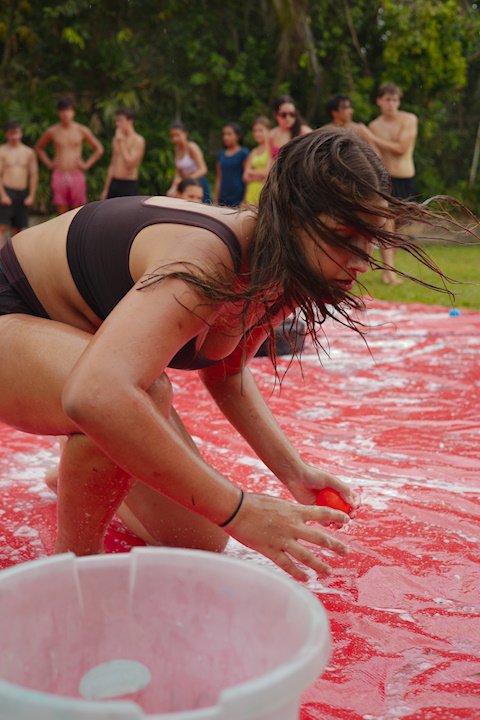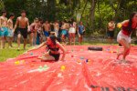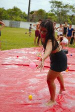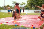 E outra, e mais outra. Esses Carcará são duros na queda. Caem, mas levantam de novo como se nada tivesse acontecido. Hoje foi dia de Lona 2.0! Uma reedição da brincadeira sobre uma lona de sabão, acrescentando um nível de dificuldade: amarrados um contra o outro, precisam levar bolinhas para encher seu balde. Não sem tomar um escorregão e ser arrastado deslizando até o lado contrário do que precisa.