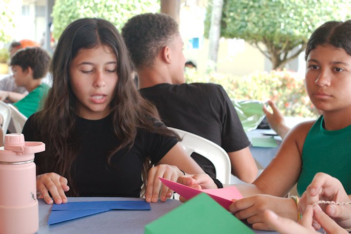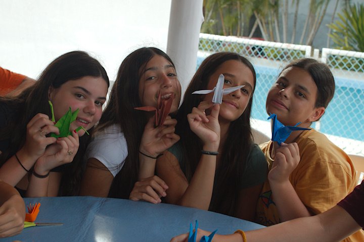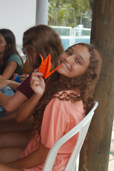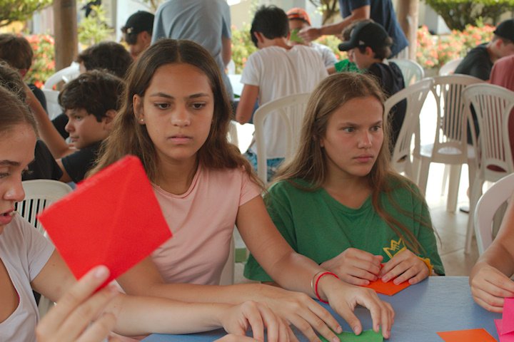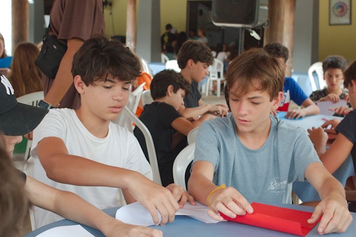 Depois de um almoço farto e um descanso revitalizante, nada melhor para os nossos bacuraus do que uma oficina que estimule a atenção e a autonomia. Sim, estou falando do origami! A conhecida e tradicional arte japonesa de dobrar papel, entre tantos benefícios, ainda funciona como uma terapia! E como tudo por aqui é sobre pássaros, é claro que o produto final dessa oficina seria formar um belo passarinho. E num passe de mágica (na verdade, sob as orientações do tio Tom), os retângulos de papel deram vida a diversos mini bacuraus!